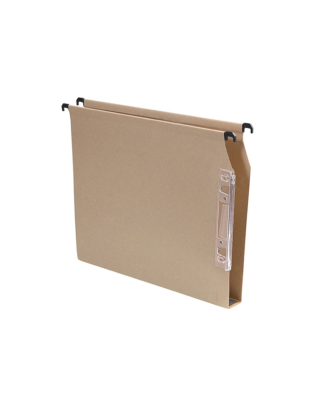 Fabricada en cartulina kraft de 230 g/m². Incluye visor lateral. Varillas metal flex. Lomo en U de 20 mm reforzado. Sistema de unión por solapa. Formato DIN A4.