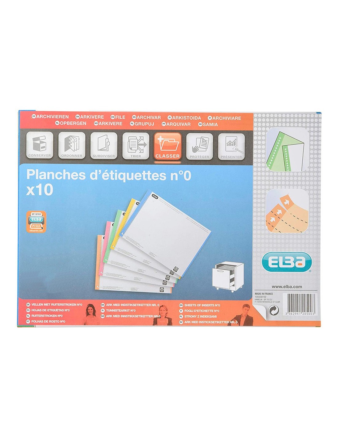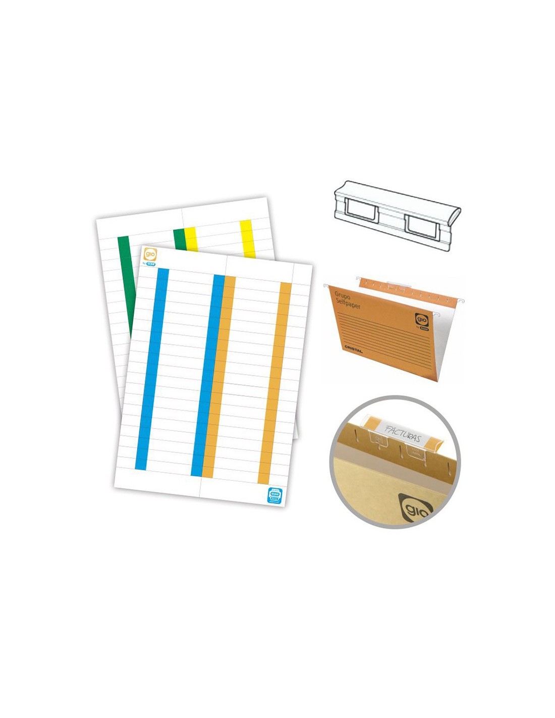Etiquetas pretroqueladas con bordes en azul, naranja, verde y amarillo. Para carpetas colgantes de visor superior de 80 mm de largo. Personalizables en www.elbaprint.es. Paquetes de 10 hojas de 25 etiquetas.