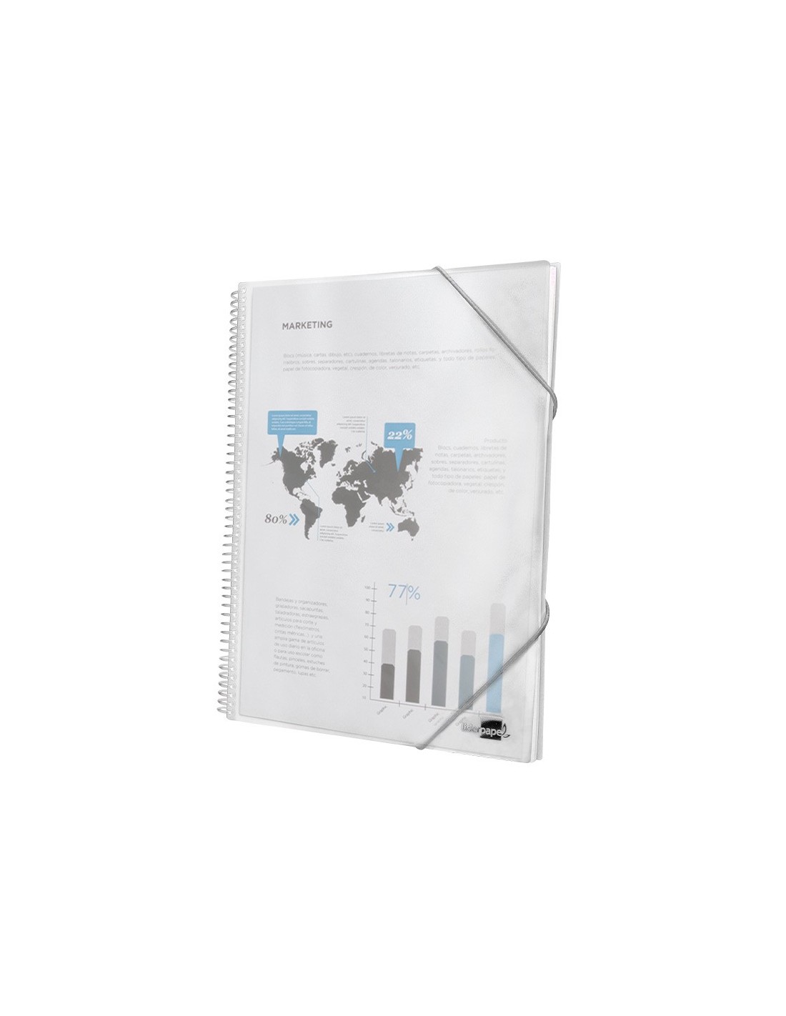 Carpeta escaparate fabricada en polipropileno translúcido. Cubierta rígida. Encuadernada con espiral para mayor comodidad y cierre con gomilla. Portada 750 micras. Fundas 75 micras.