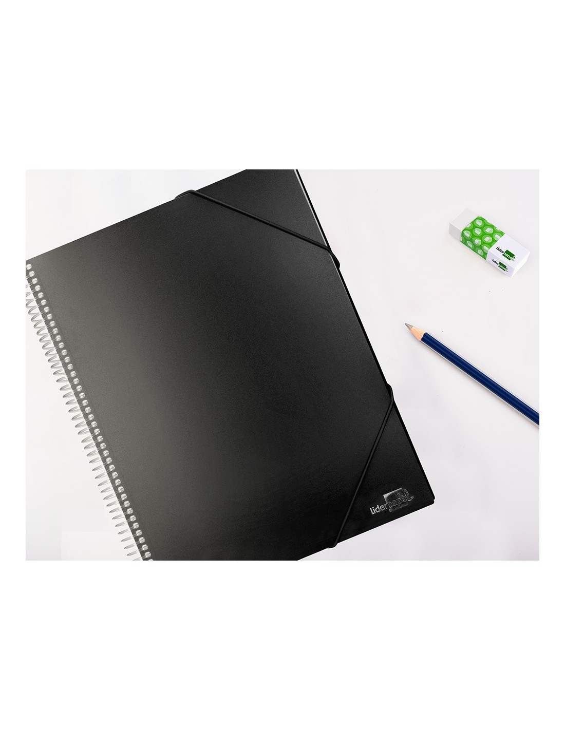 Carpeta escaparate fabricada en polipropileno translúcido. Cubierta rígida. Encuadernada con espiral para mayor comodidad y cierre con gomilla. Portada 750 micras. Fundas 75 micras.