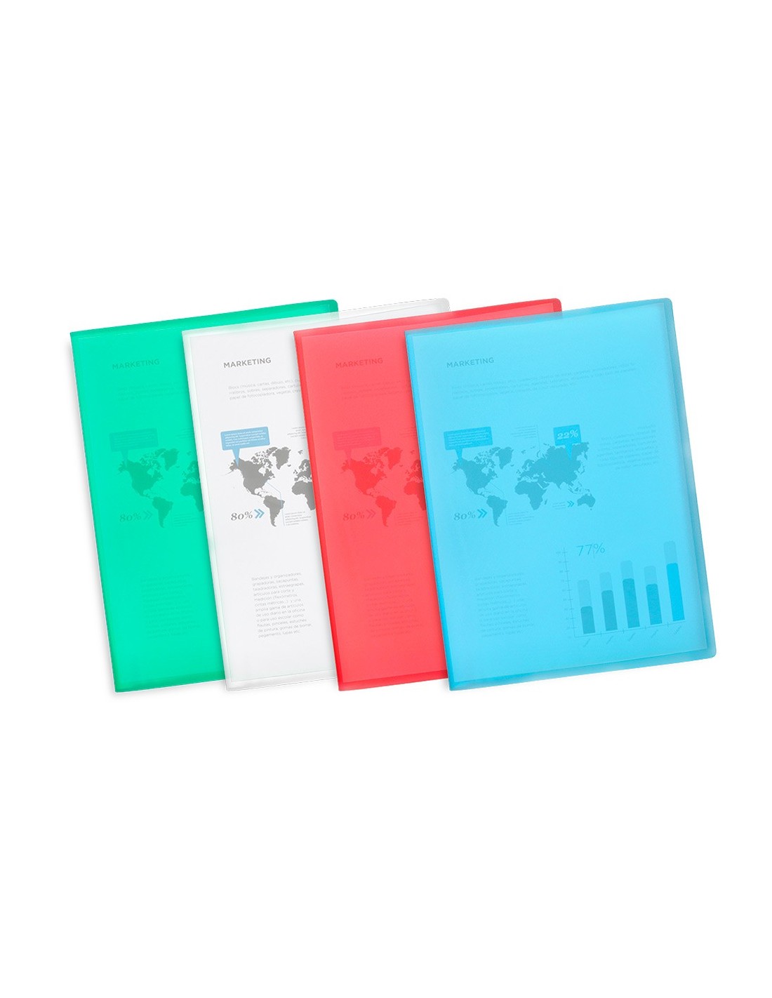Fabricada en polipropileno translúcido. Formato DIN A4. Portada flexible. Colores frosty. Portada 400 micras. Fundas 40 micras.