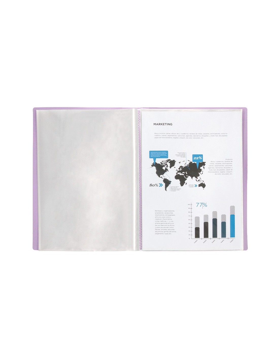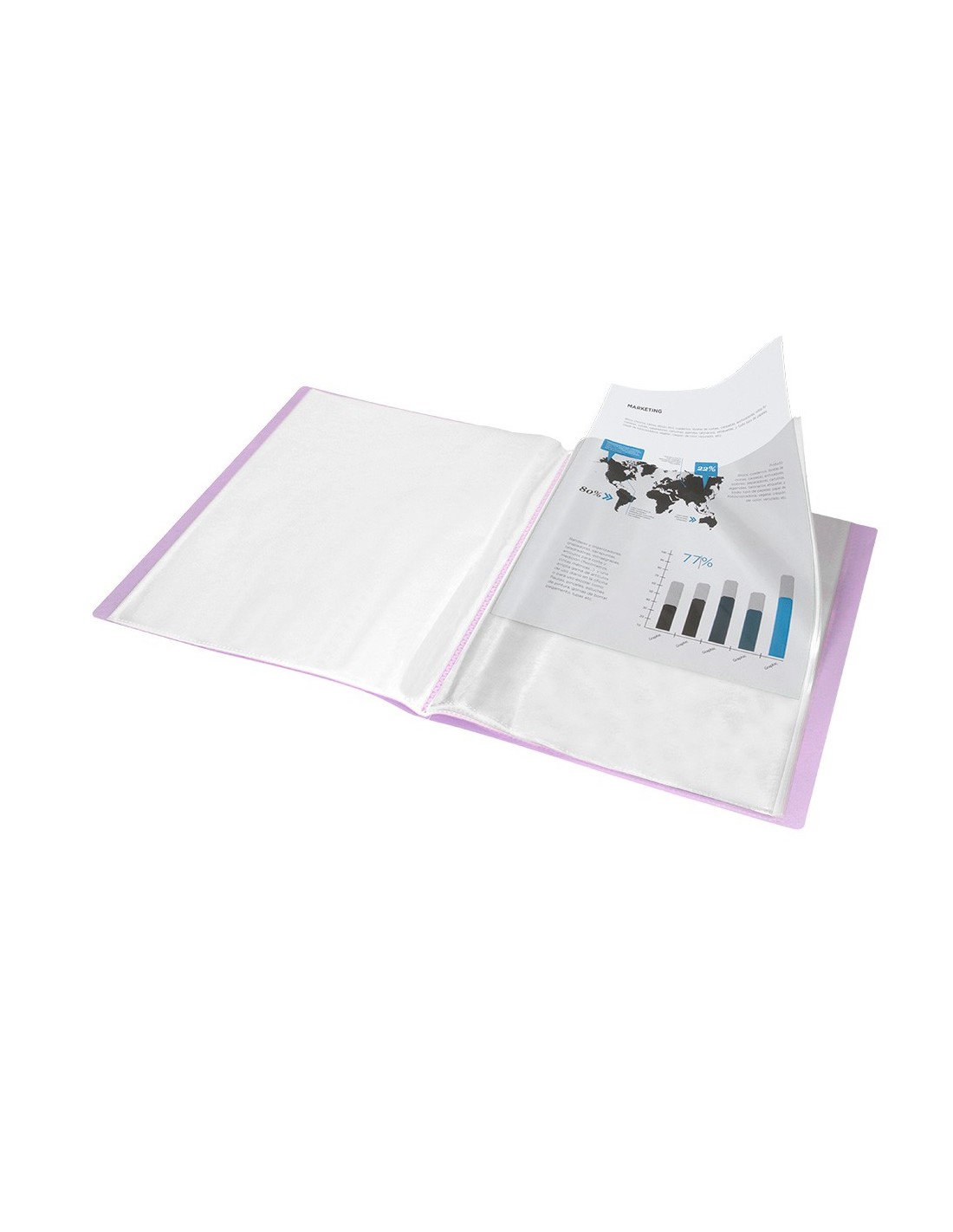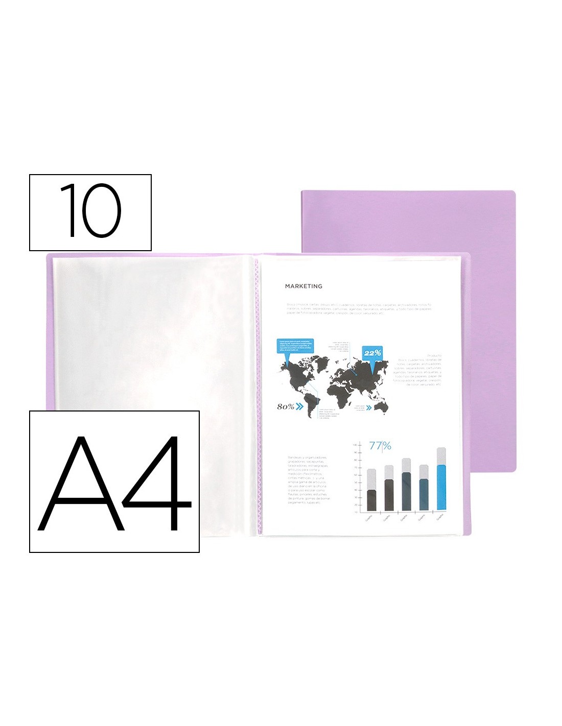 Fabricada en polipropileno. Portada flexible. Formato DIN A4. Colores opacos. Disponibles en 10, 20, 30, 40, 60 y 80 fundas. Portada 400 micras. Fundas 40 micras.