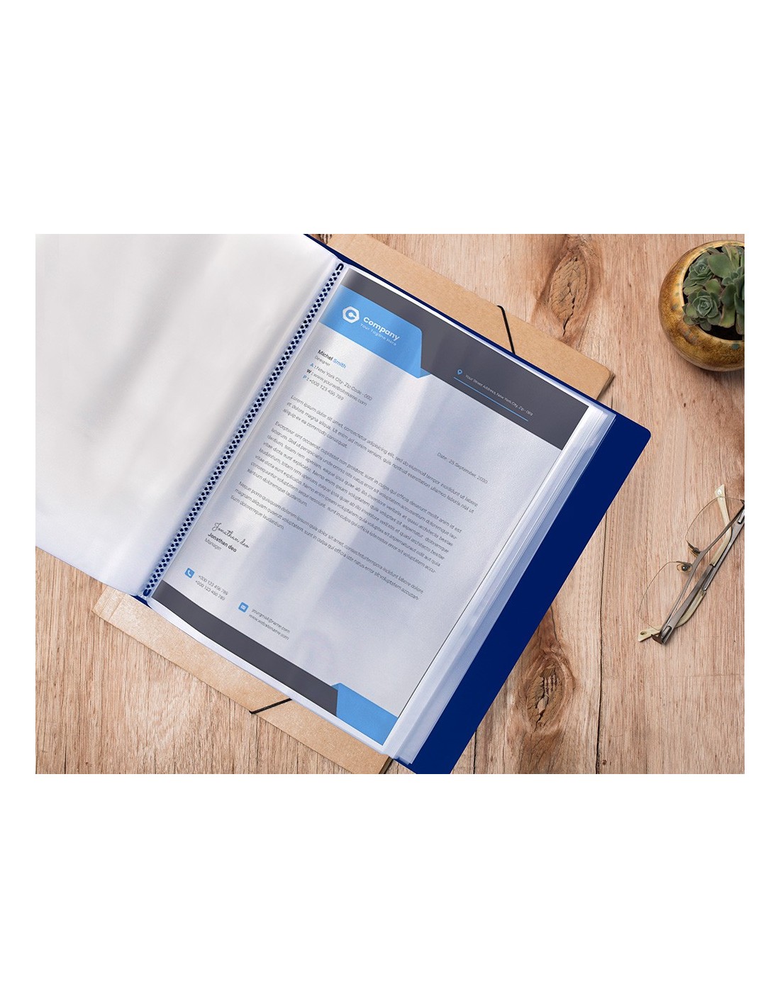 Fabricada en polipropileno. Con portada y lomo personalizables. Formato DIN A4. Portada 400 micras. Colores translúcidos. Fundas 40 micras.