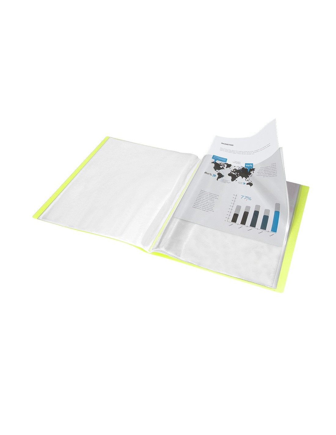 Fabricada en polipropileno. Portada flexible. Formato DIN A4. Colores opacos. Disponibles en 10, 20, 30, 40, 60 y 80 fundas. Portada 400 micras. Fundas 40 micras.