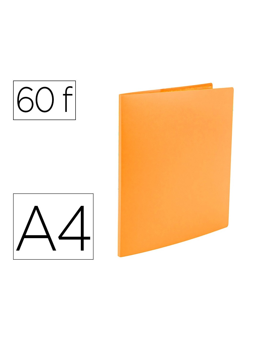 Fabricada en polipropileno. Portada flexible. Formato DIN A4. Colores opacos. Disponibles en 10, 20, 30, 40, 60 y 80 fundas. Portada 400 micras. Fundas 40 micras.