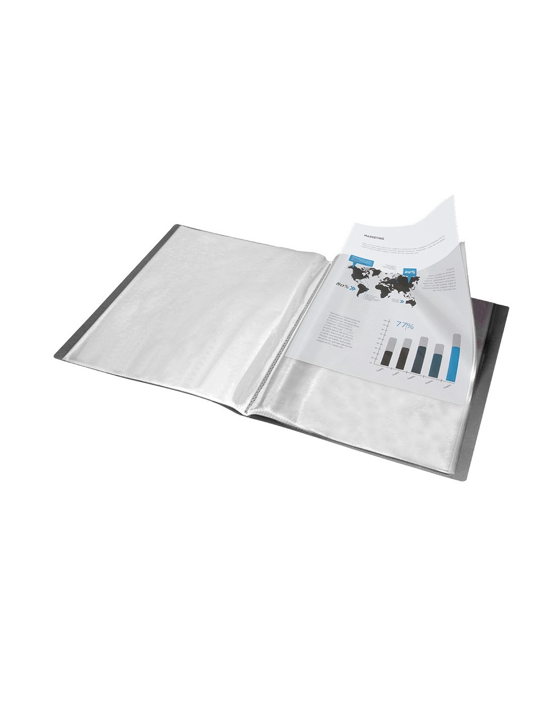 Fabricada en polipropileno. Portada flexible. Formato DIN A4. Colores opacos. Disponibles en 10, 20, 30, 40, 60 y 80 fundas. Portada 400 micras. Fundas 40 micras.