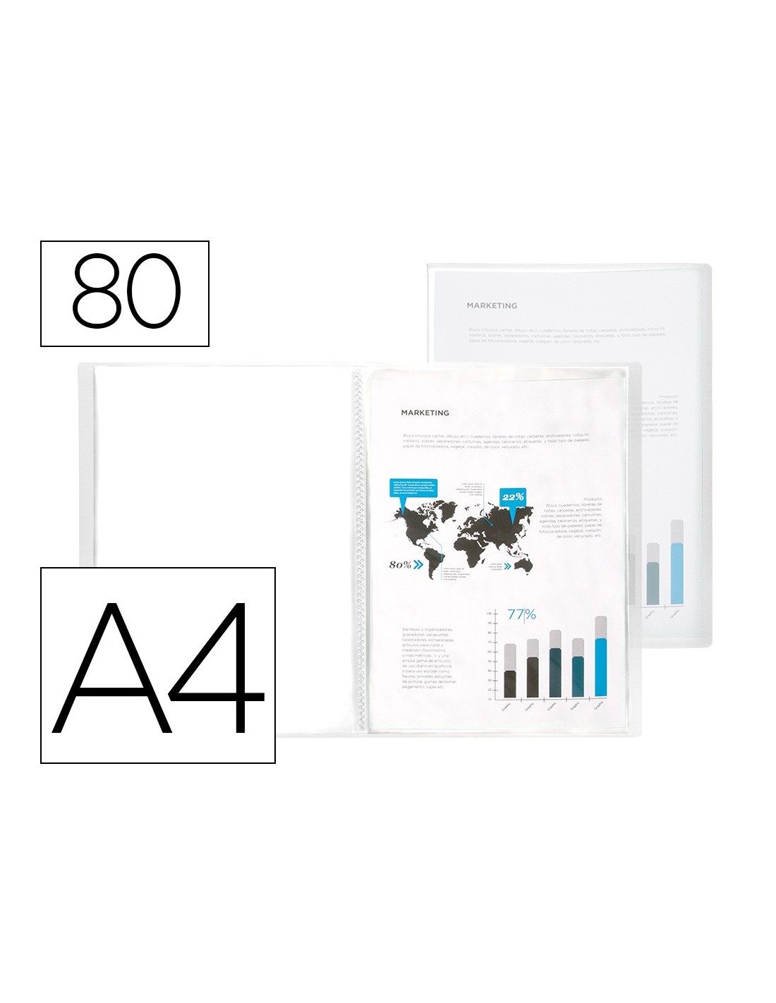 Fabricada en polipropileno translúcido. Formato DIN A4. Portada flexible. Colores frosty. Portada 400 micras. Fundas 40 micras.