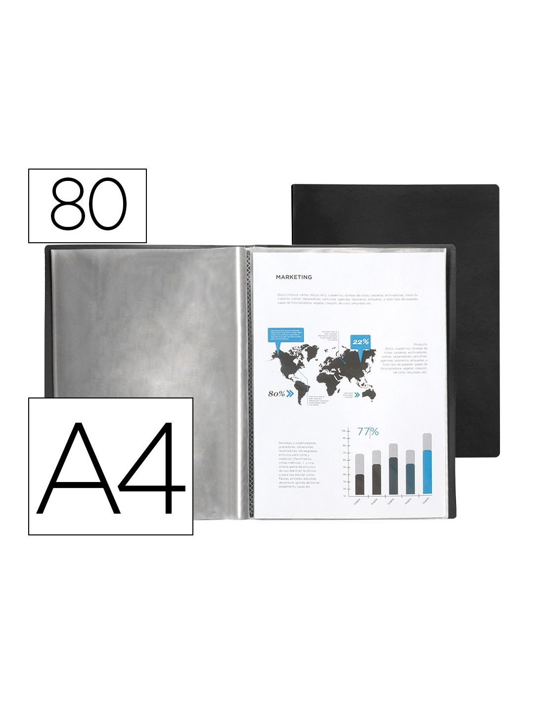 Fabricada en polipropileno. Portada flexible. Formato DIN A4. Colores opacos. Disponibles en 10, 20, 30, 40, 60 y 80 fundas. Portada 400 micras. Fundas 40 micras.