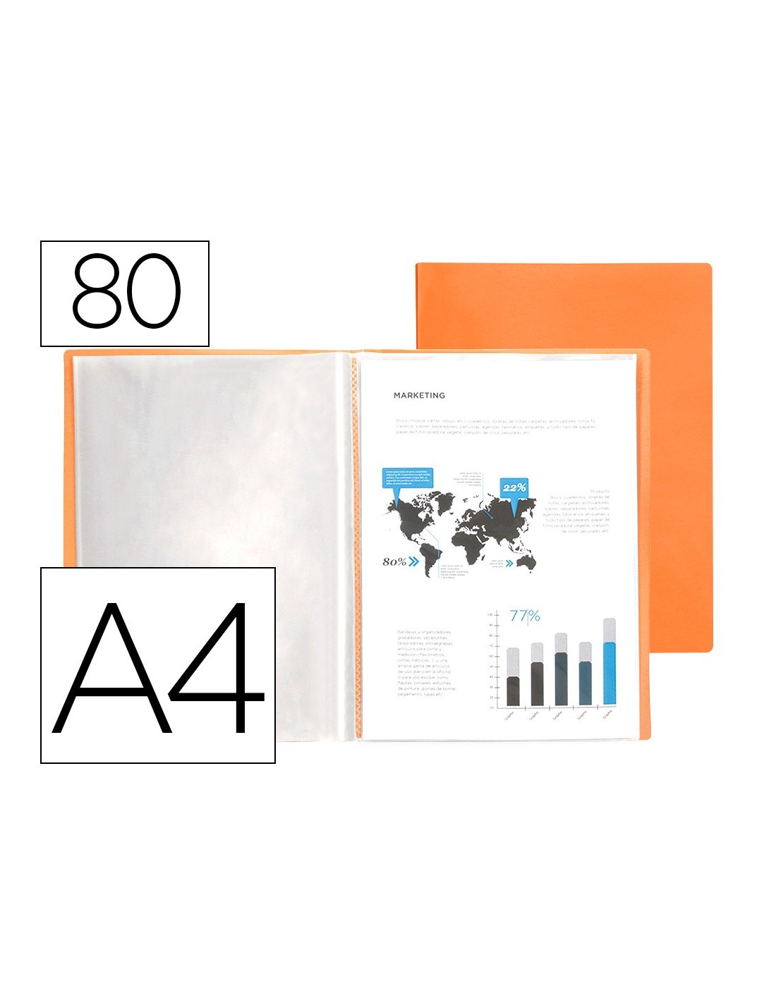Fabricada en polipropileno. Portada flexible. Formato DIN A4. Colores opacos. Disponibles en 10, 20, 30, 40, 60 y 80 fundas. Portada 400 micras. Fundas 40 micras.