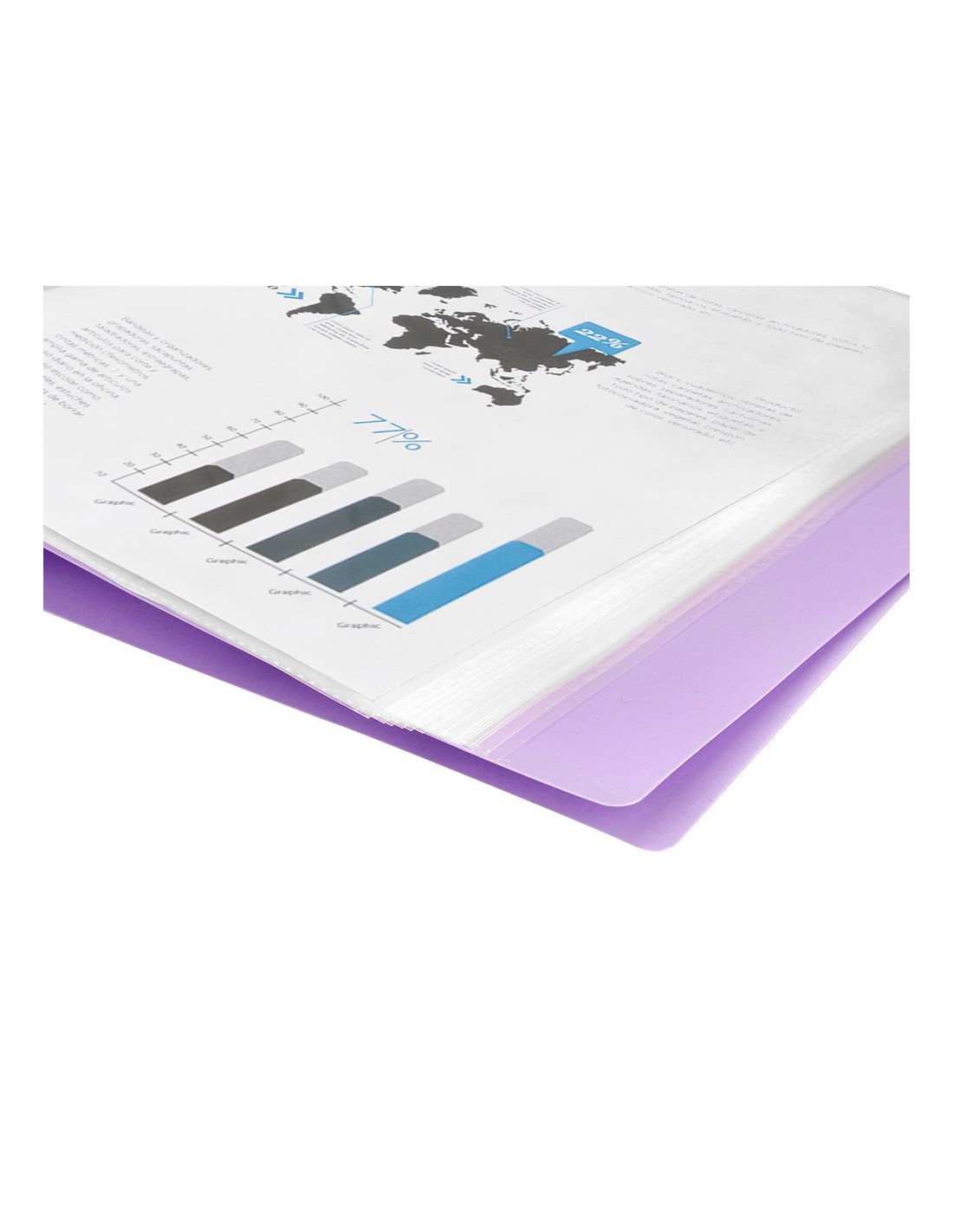 Fabricada en polipropileno. Portada flexible. Formato DIN A4. Colores opacos. Disponibles en 10, 20, 30, 40, 60 y 80 fundas. Portada 400 micras. Fundas 40 micras.