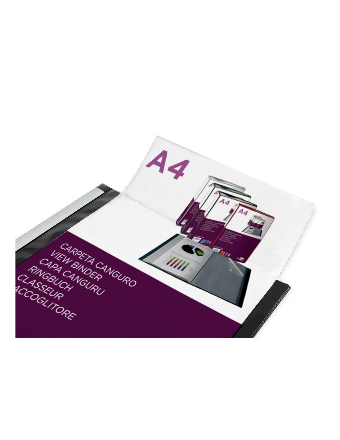 Carpeta de fundas fijas con portada y lomo personalizables. Fabricada en polipropileno. Colores translúcidos. Formato DIN A4.