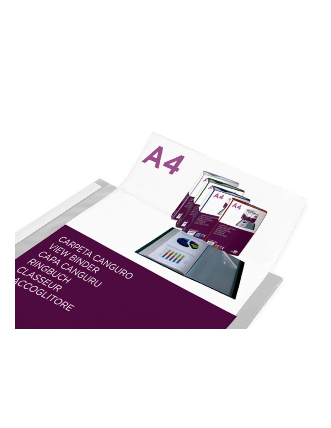 Carpeta de fundas fijas con portada y lomo personalizables. Fabricada en polipropileno. Colores translúcidos. Formato DIN A4.