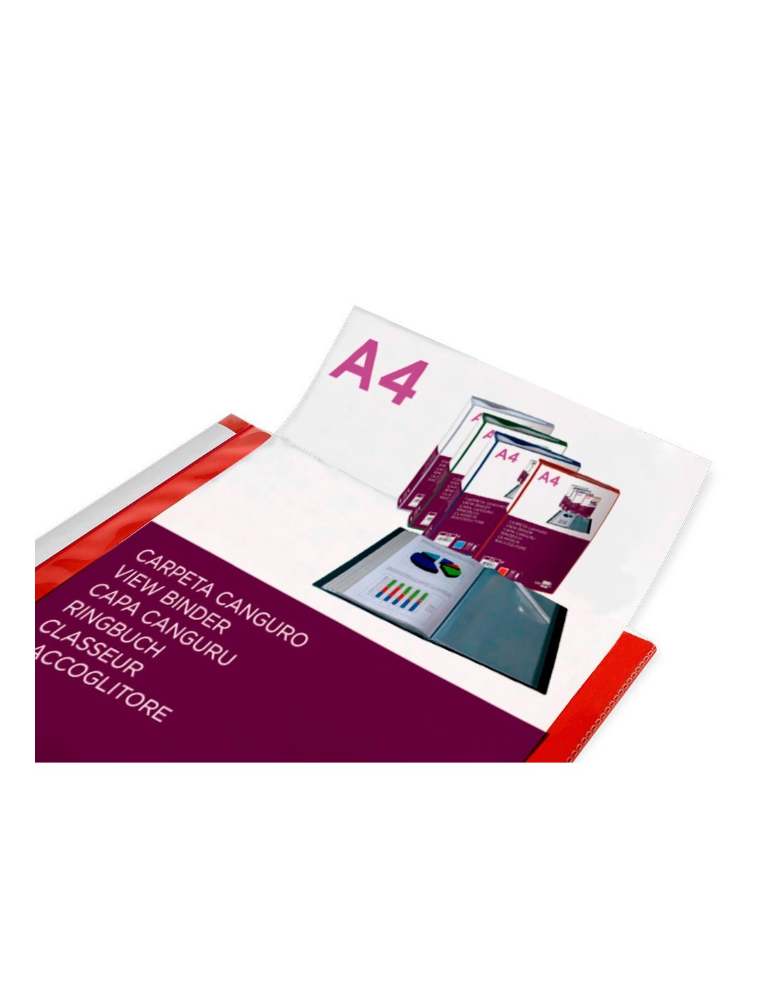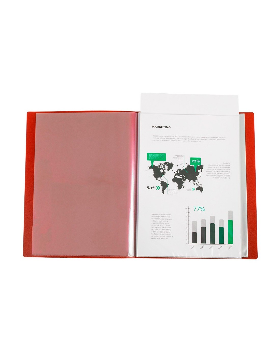 Carpeta de fundas fijas con portada y lomo personalizables. Fabricada en polipropileno. Colores translúcidos. Formato DIN A4.
