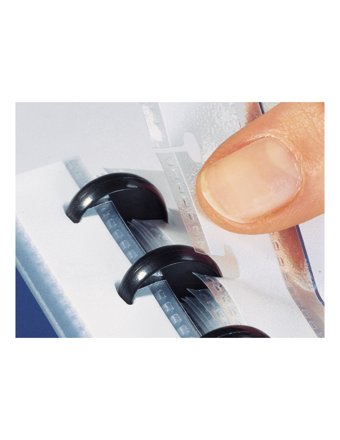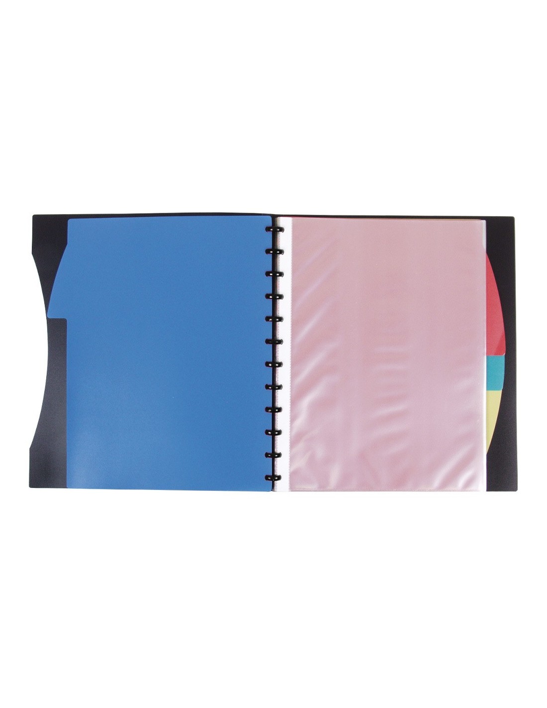 Carpeta con 40 fundas de 75 micras intercambiables, fabricada en polipropileno, con sobre interior para guardar documentos y 5 separadores. Anillas en plástico. Portada personalizable de 600 micras. Formato DIN A4.
