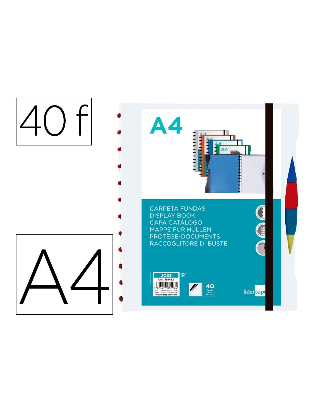 Carpeta con 40 fundas de 75 micras intercambiables, fabricada en polipropileno, con sobre interior para guardar documentos y 5 separadores. Anillas en plástico. Portada personalizable de 600 micras. Formato DIN A4.