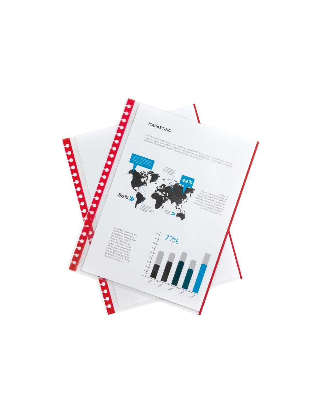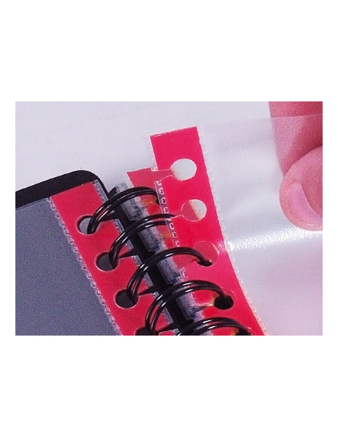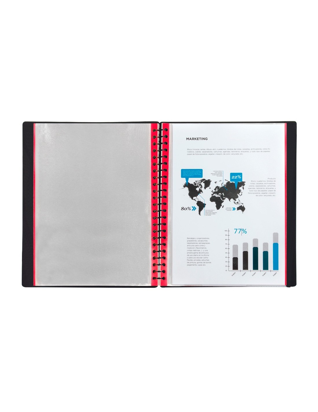 Fabricada en polipropileno con espiral doble metálica. Formato DIN A4. Color negro. Con 20 fundas extraíbles con bordes de colores de 70 micras de grosor. Portada de 700 micras de grosor.