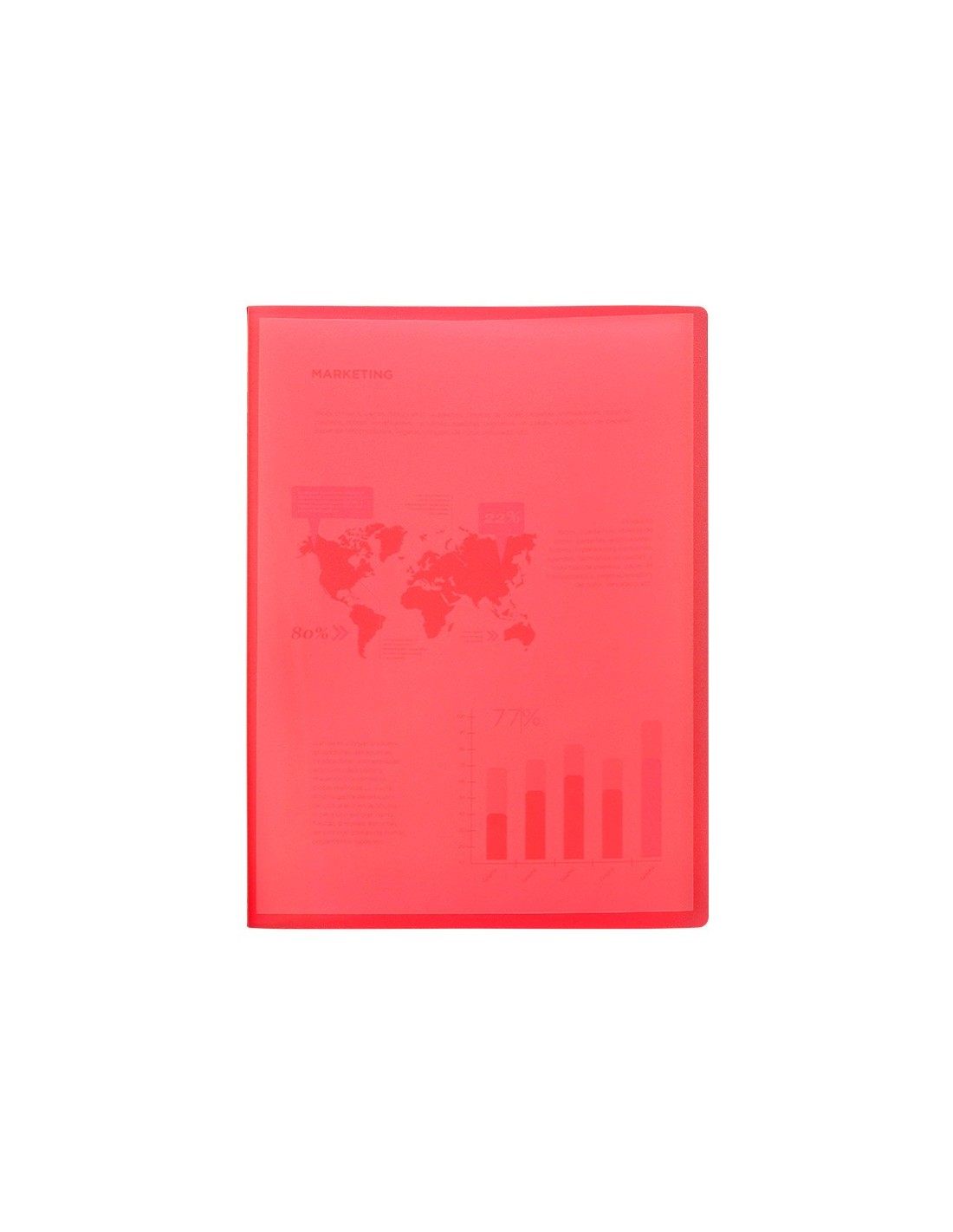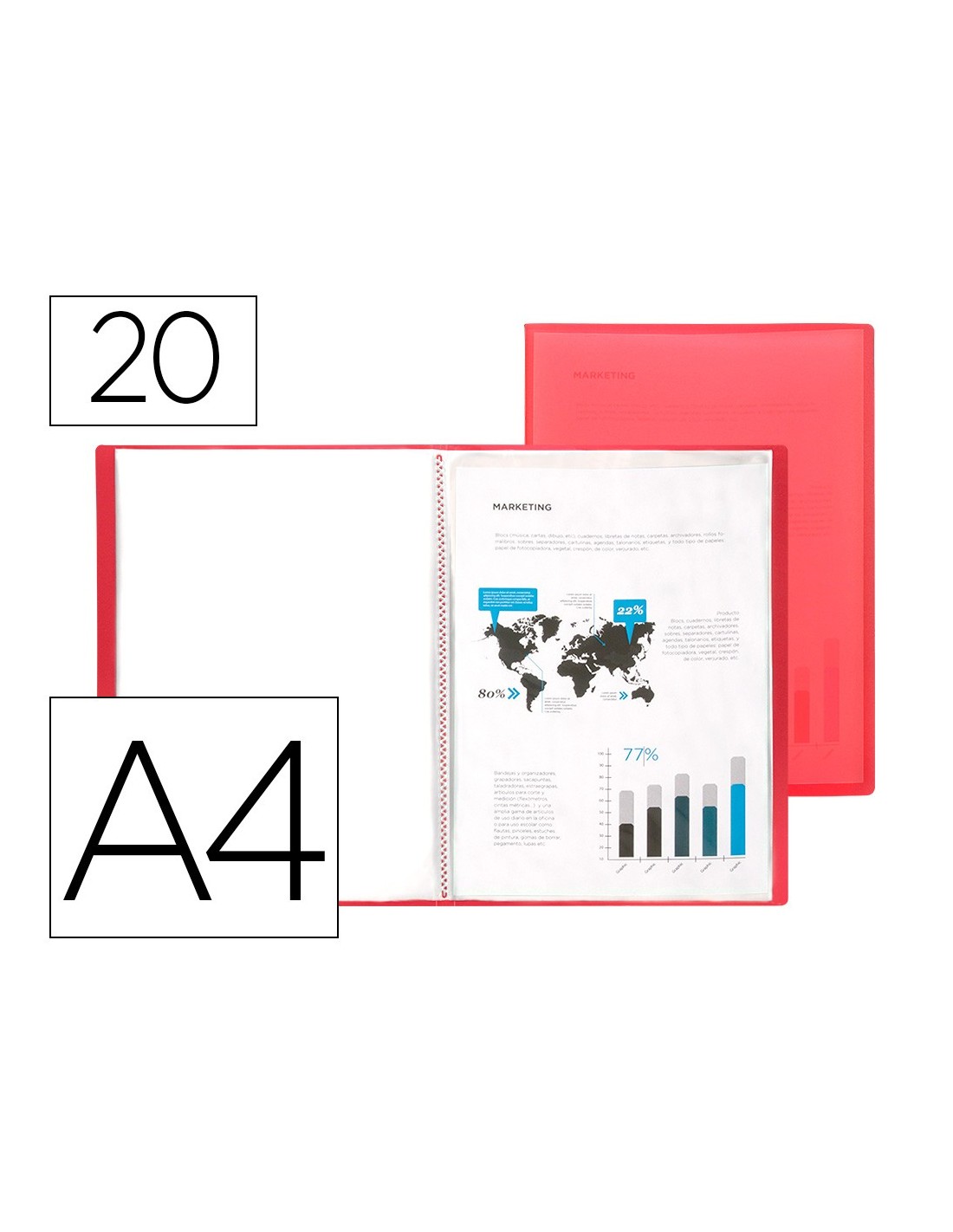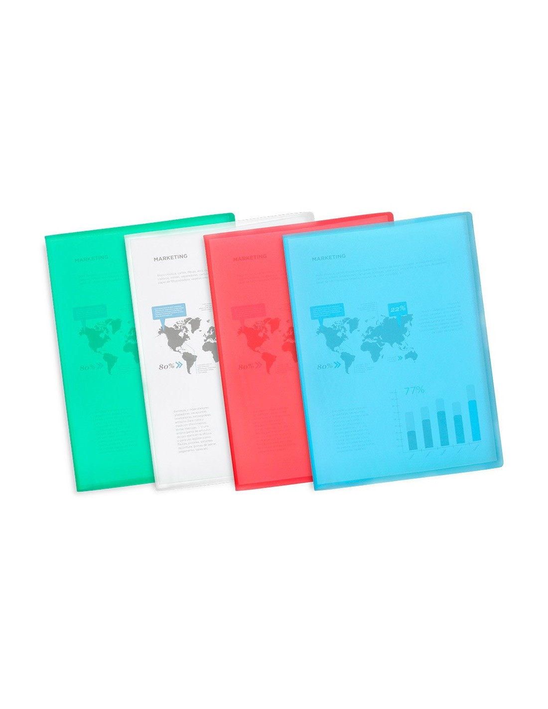Fabricada en polipropileno translúcido. Formato DIN A4. Portada flexible. Colores frosty. Portada 400 micras. Fundas 40 micras.