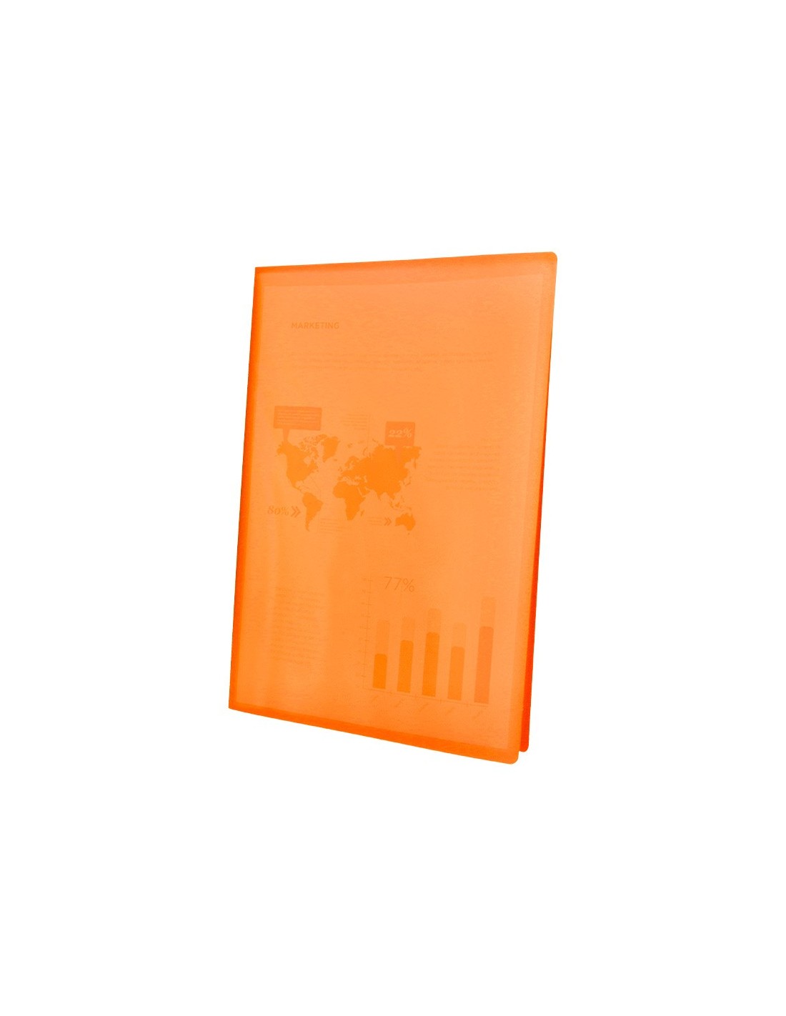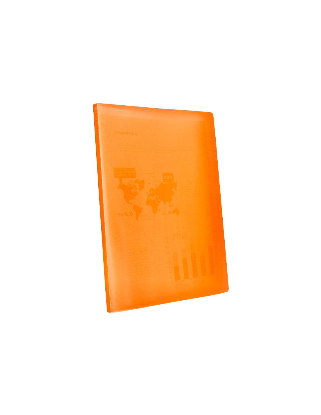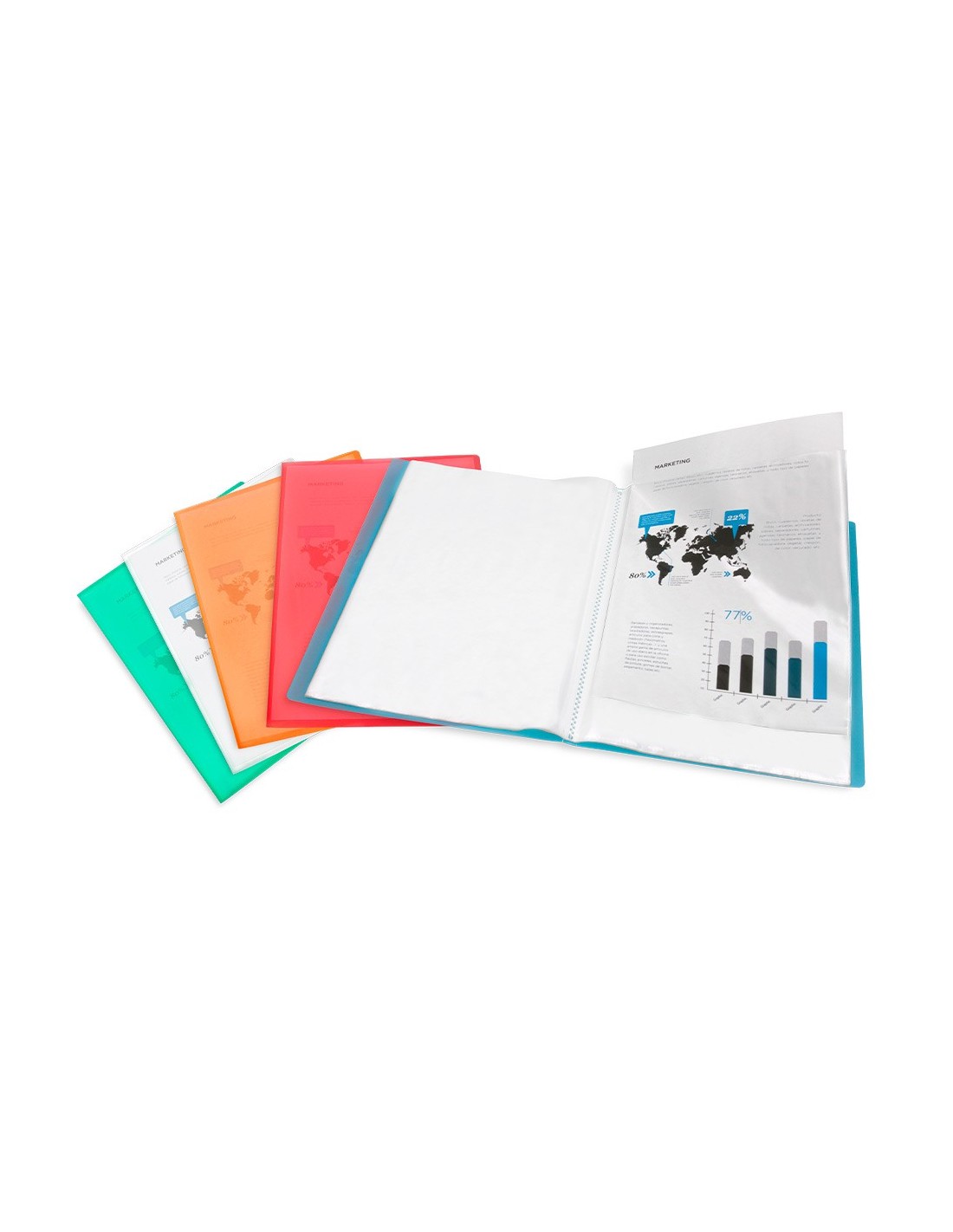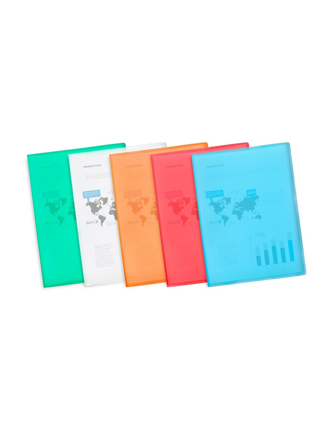 Fabricada en polipropileno translúcido. Formato Din A4. Portada flexible. Colores frosty. Portada 400 micras. Fundas 40 micras.