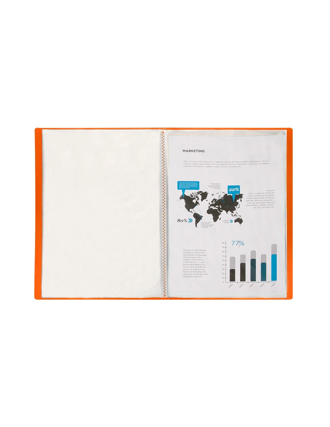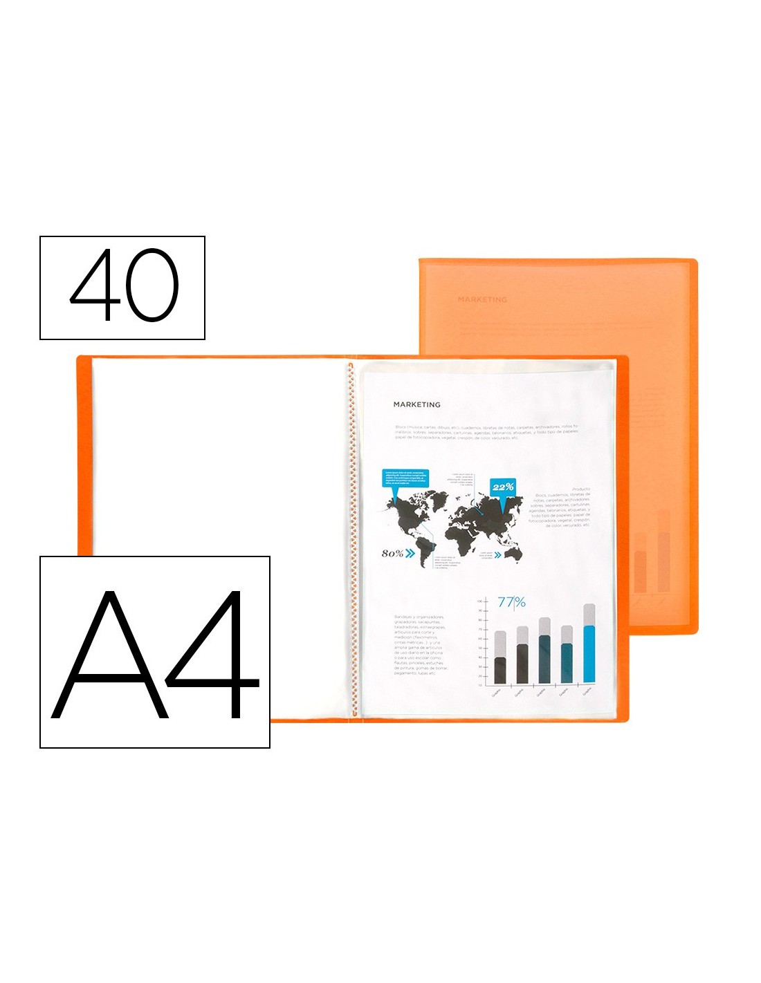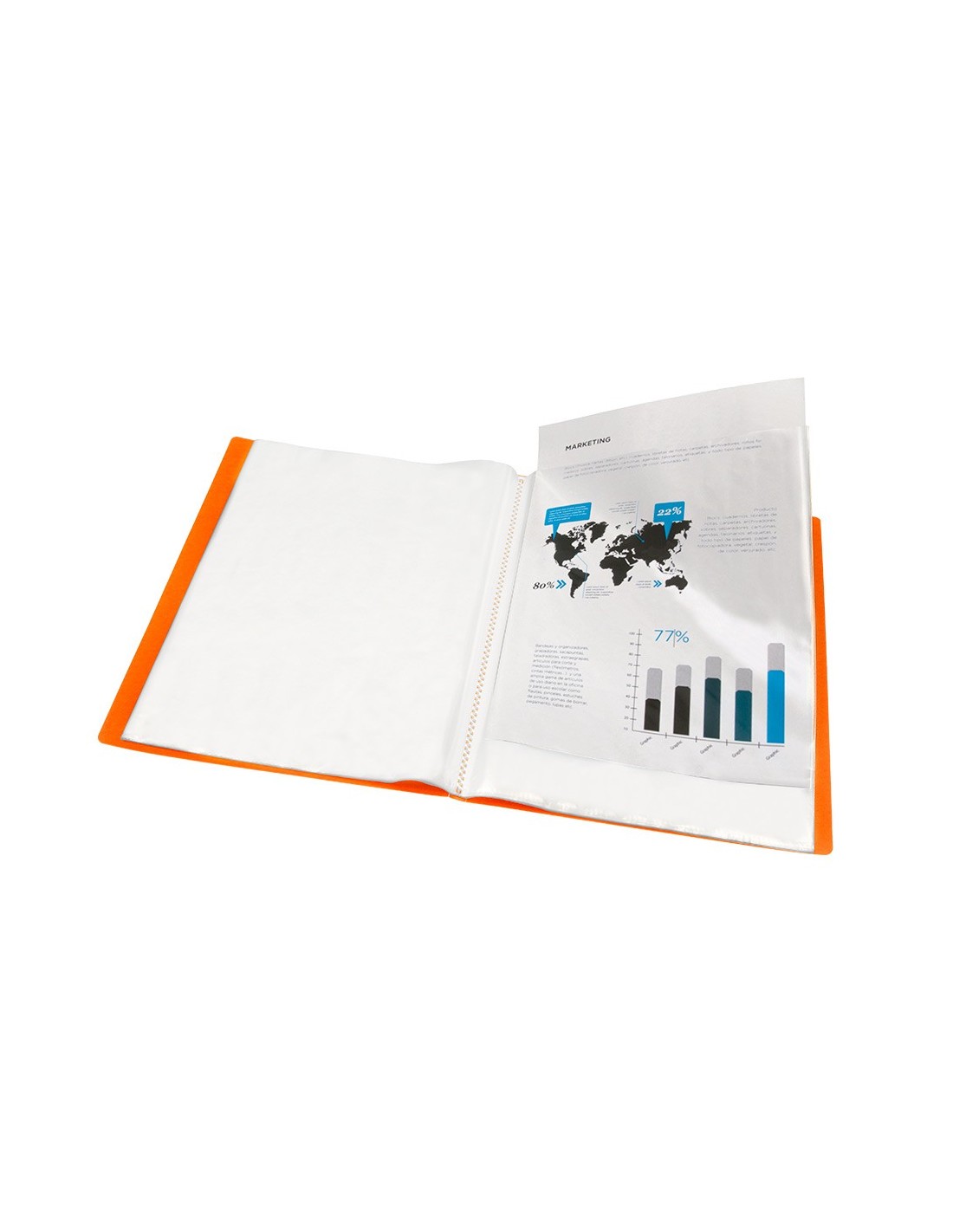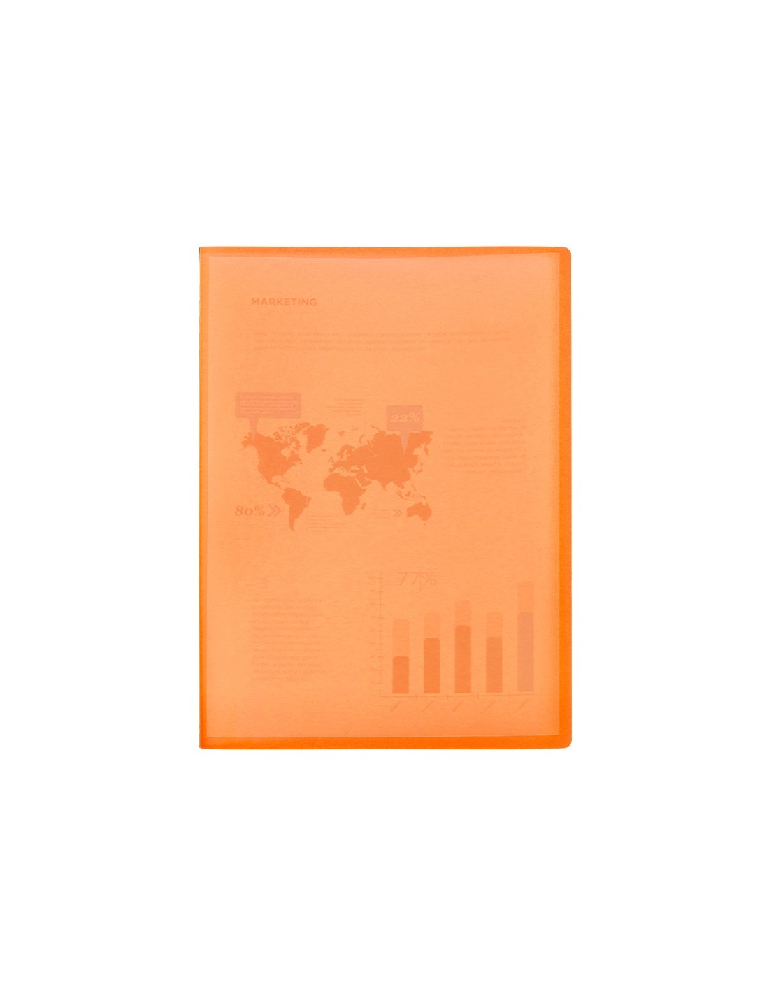 Fabricada en polipropileno translúcido. Formato Din A4. Portada flexible. Colores frosty. Portada 400 micras. Fundas 40 micras.