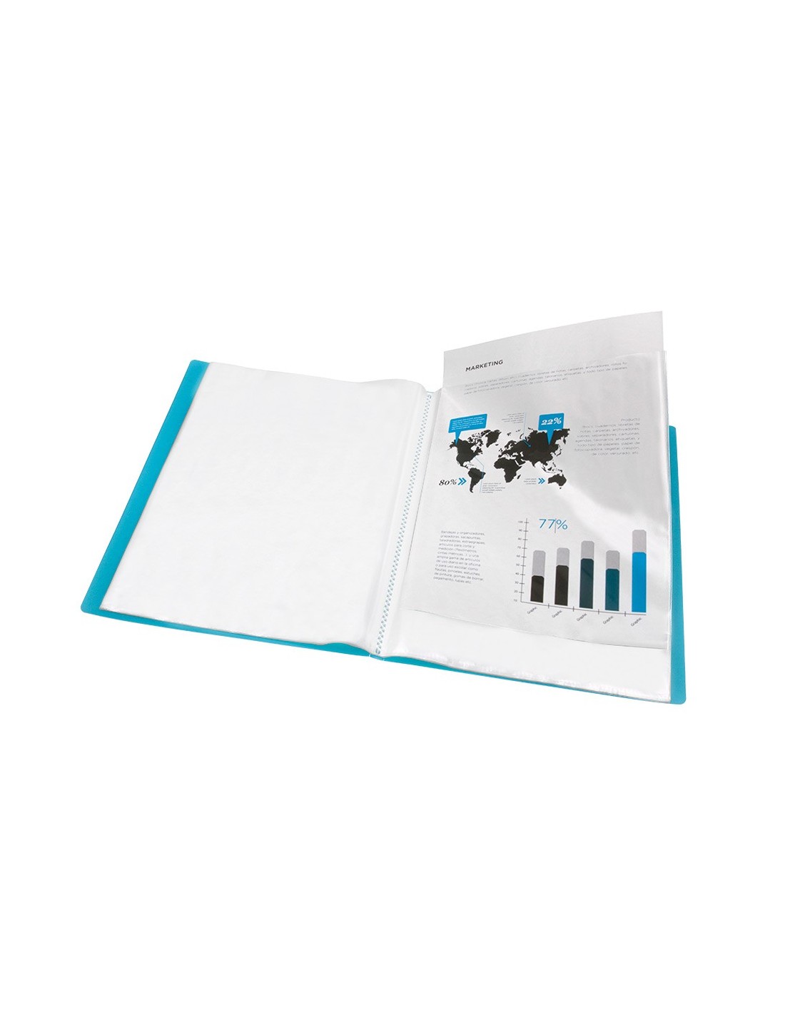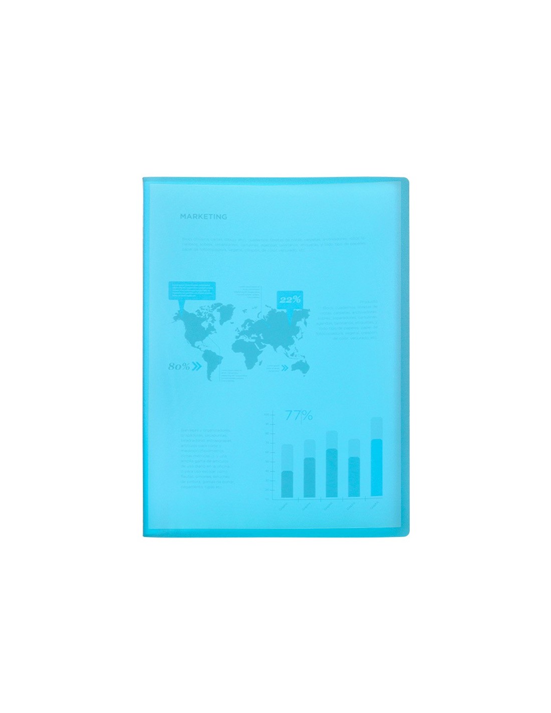 Fabricada en polipropileno translúcido. Formato DIN A4. Portada flexible. Colores frosty. Portada 400 micras. Fundas 40 micras.