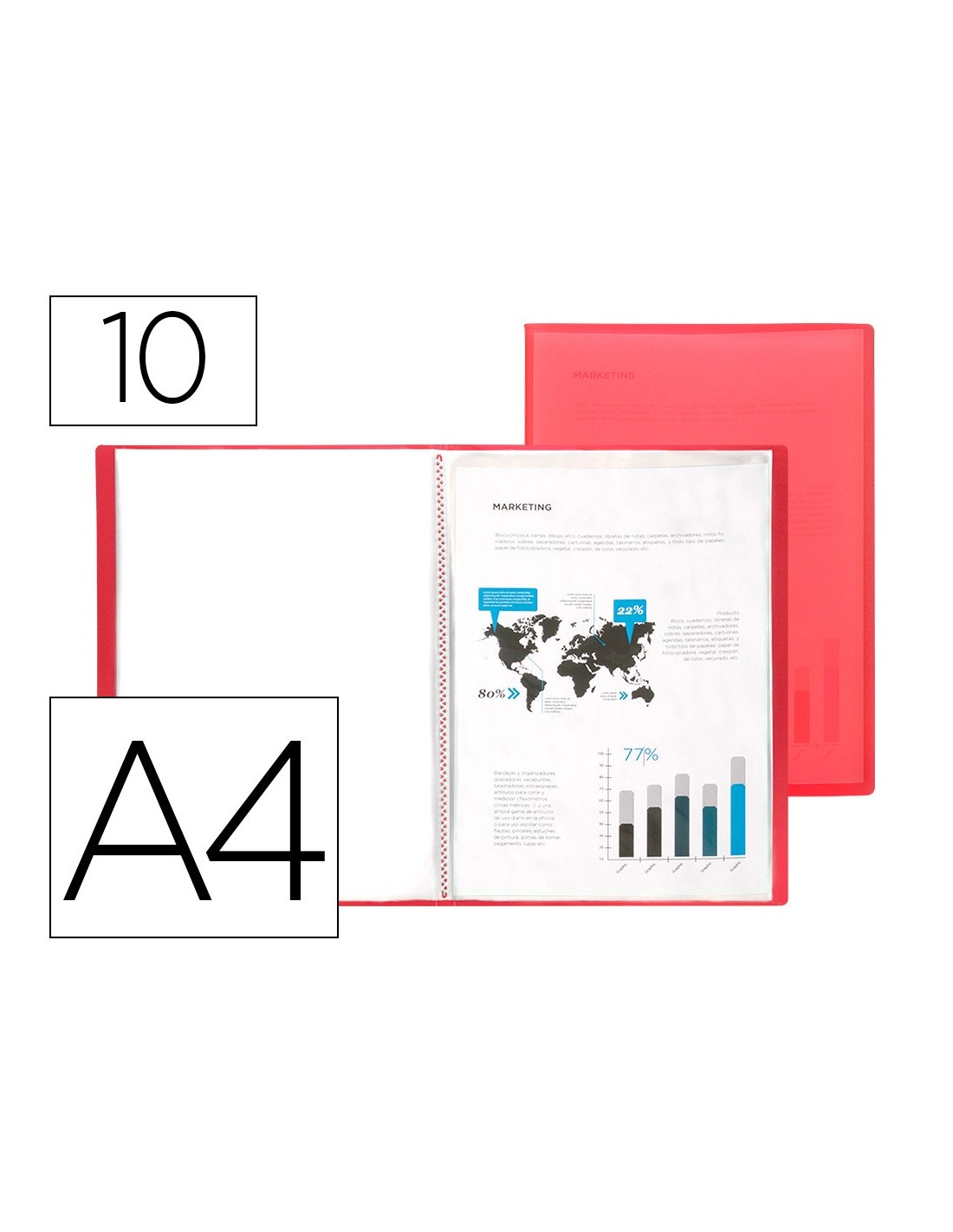 Fabricada en polipropileno translúcido. Formato DIN A4. Portada flexible. Colores frosty. Portada 400 micras. Fundas 40 micras.