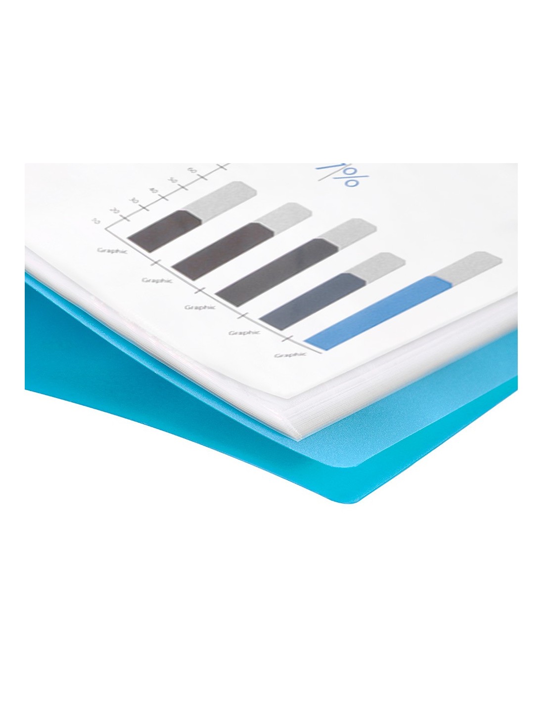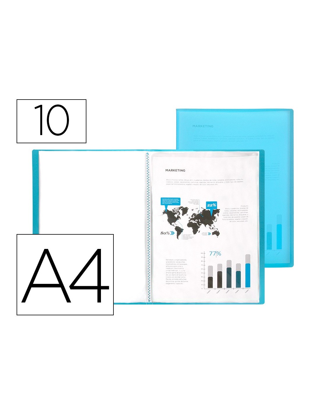 Fabricada en polipropileno translúcido. Formato DIN A4. Portada flexible. Colores frosty. Portada 400 micras. Fundas 40 micras.