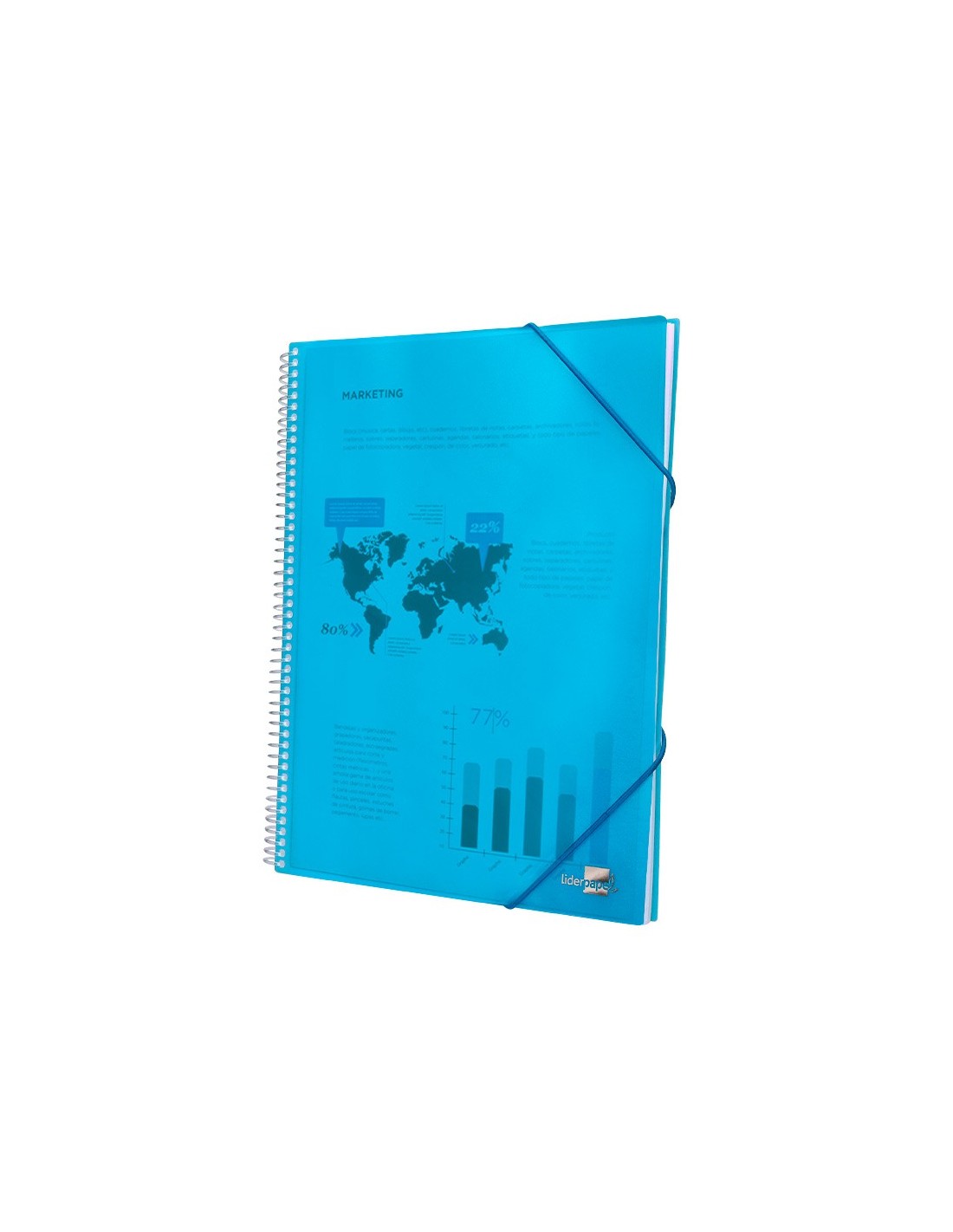 Carpeta escaparate fabricada en polipropileno translúcido. Cubierta rígida. Encuadernada con espiral para mayor comodidad y cierre con gomilla. Portada 750 micras. Fundas 75 micras.