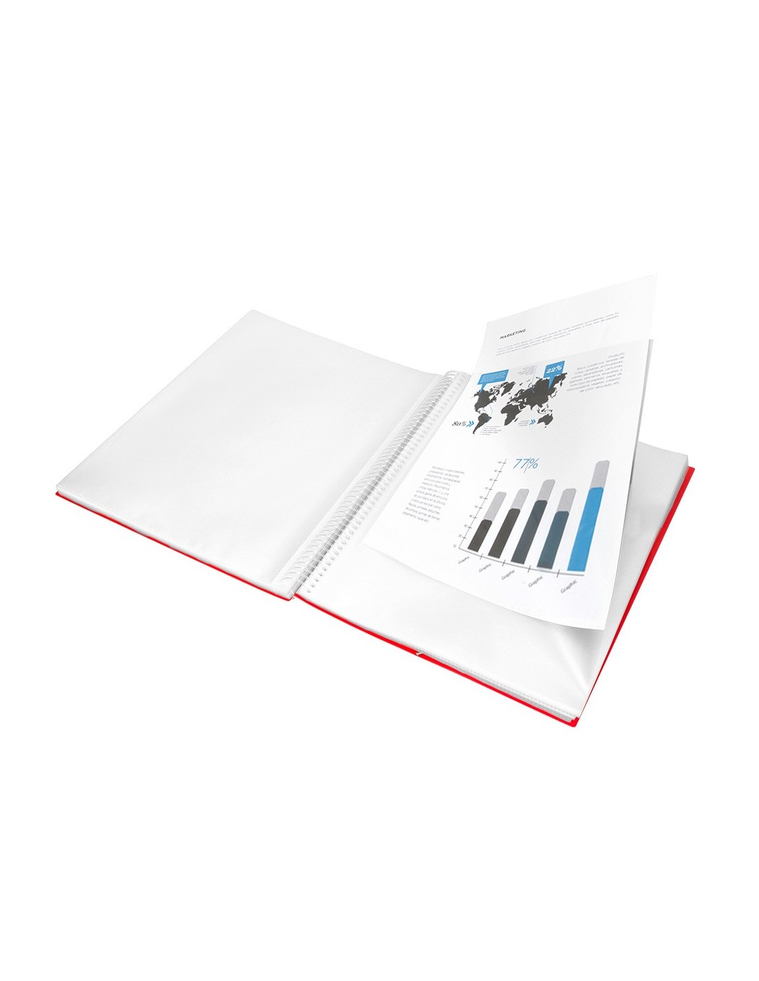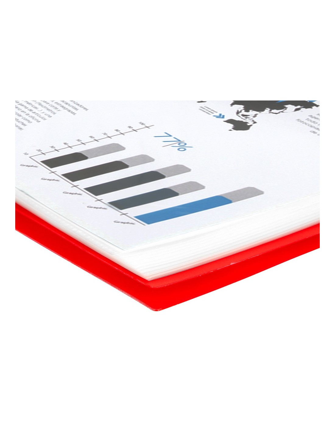 Carpeta escaparate fabricada en polipropileno translúcido. Cubierta rígida. Encuadernada con espiral para mayor comodidad y cierre con gomilla. Portada 750 micras. Fundas 75 micras.