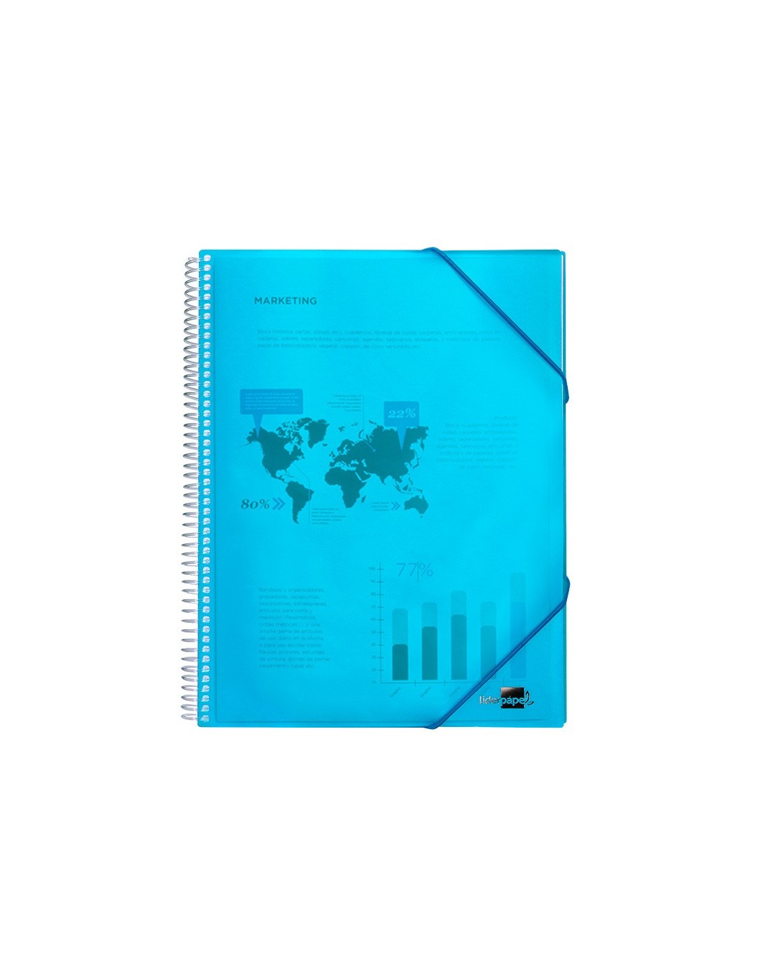 Carpeta escaparate fabricada en polipropileno translúcido. Cubierta rígida. Encuadernada con espiral para mayor comodidad y cierre con gomilla. Portada 750 micras. Fundas 75 micras.