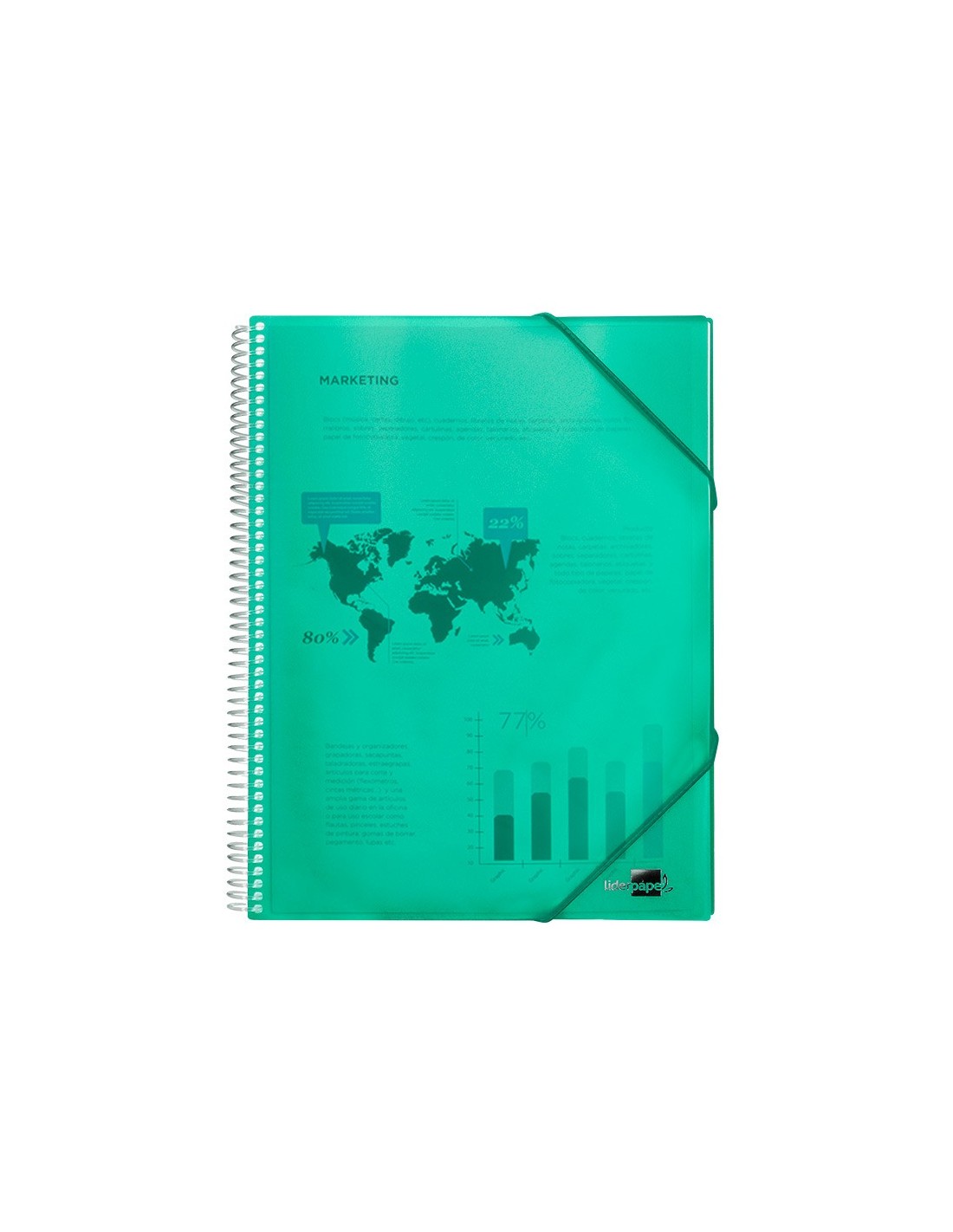 Carpeta escaparate fabricada en polipropileno translúcido. Cubierta rígida. Encuadernada con espiral para mayor comodidad y cierre con gomilla. Portada 750 micras. Fundas 75 micras.