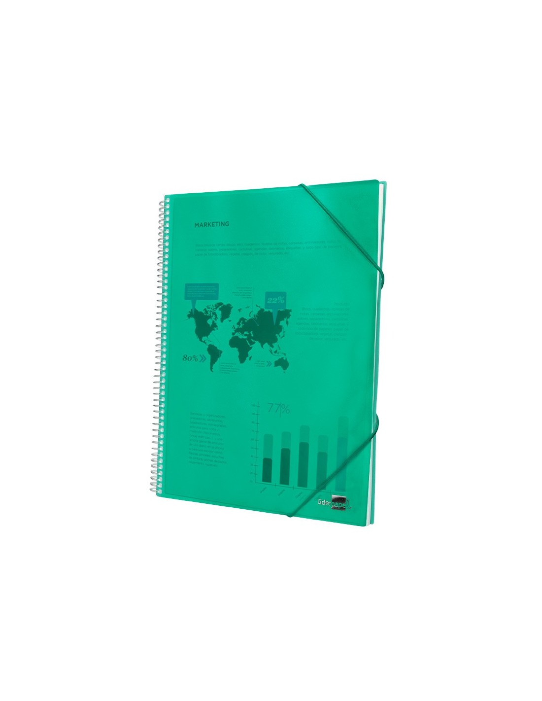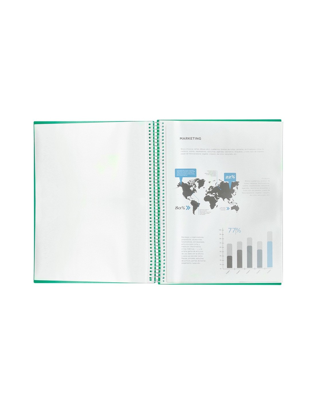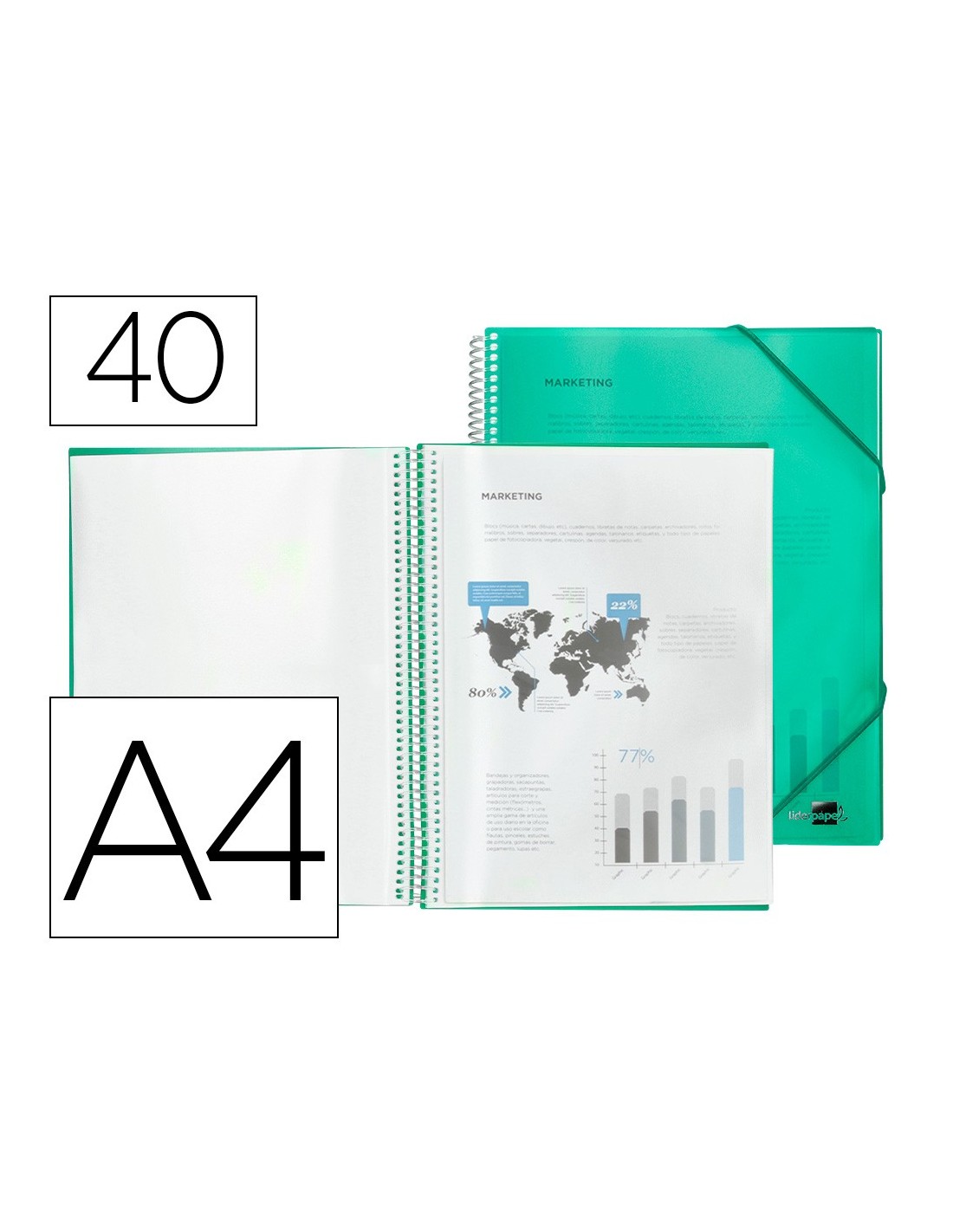Carpeta escaparate fabricada en polipropileno translúcido. Cubierta rígida. Encuadernada con espiral para mayor comodidad y cierre con gomilla. Portada 750 micras. Fundas 75 micras.