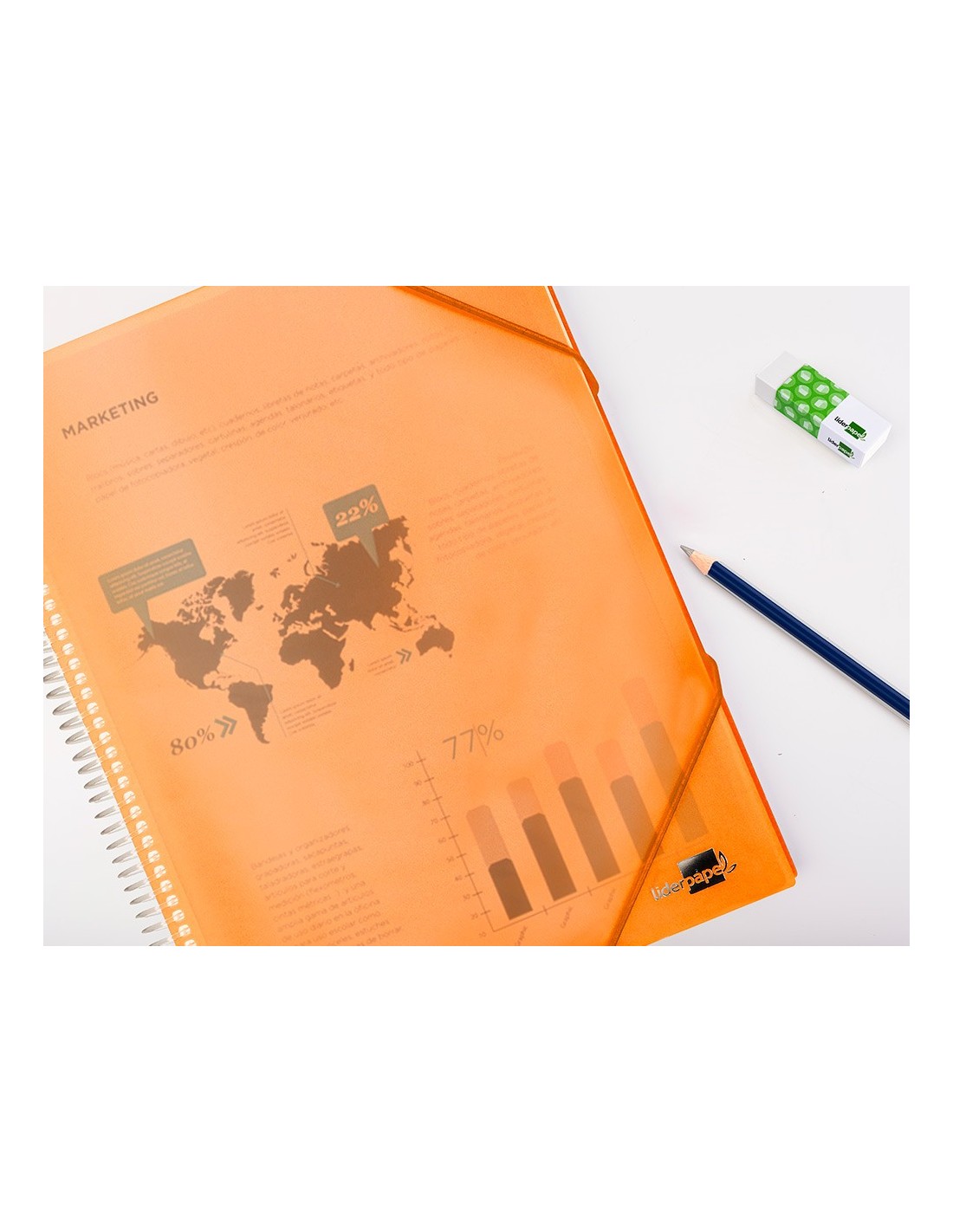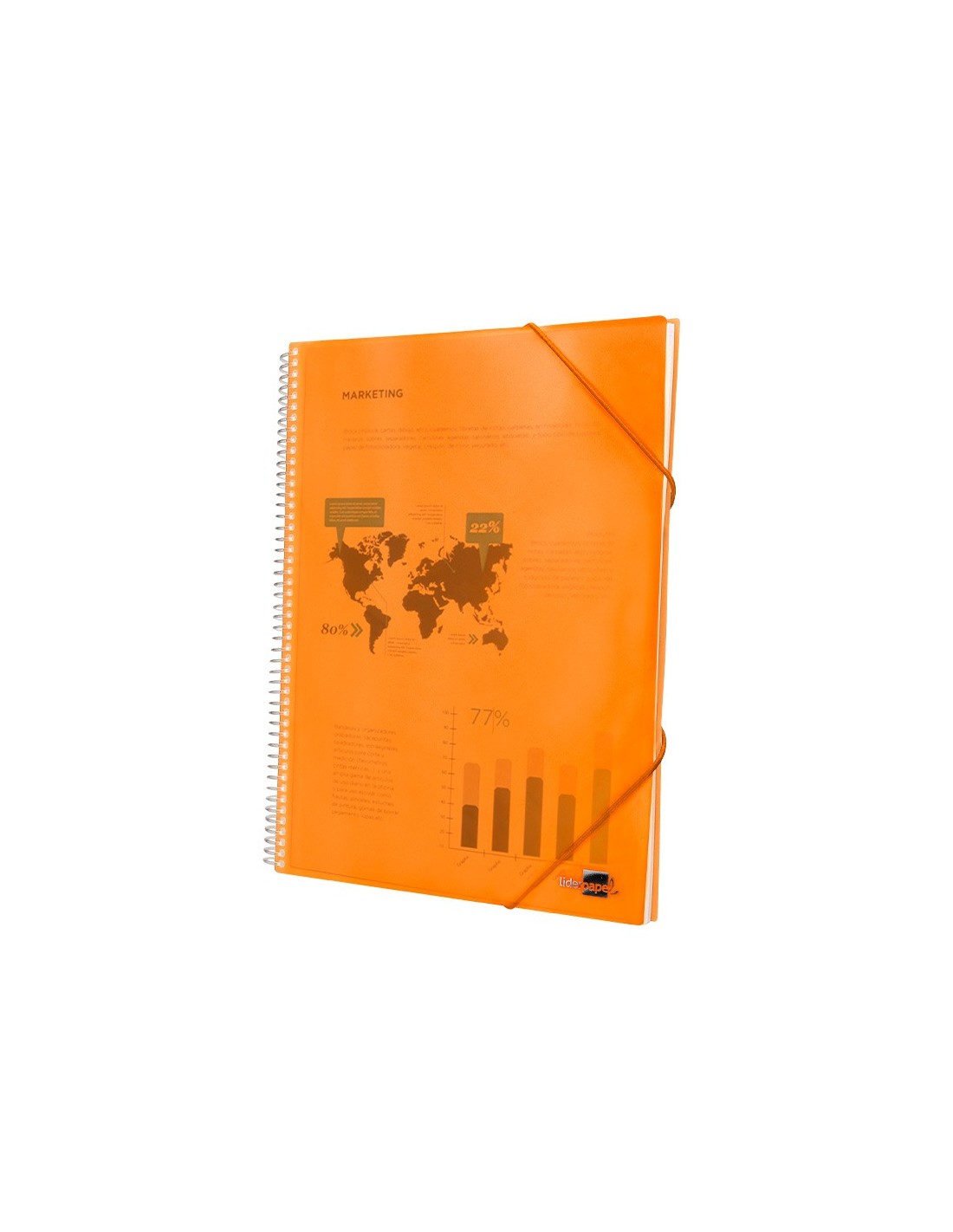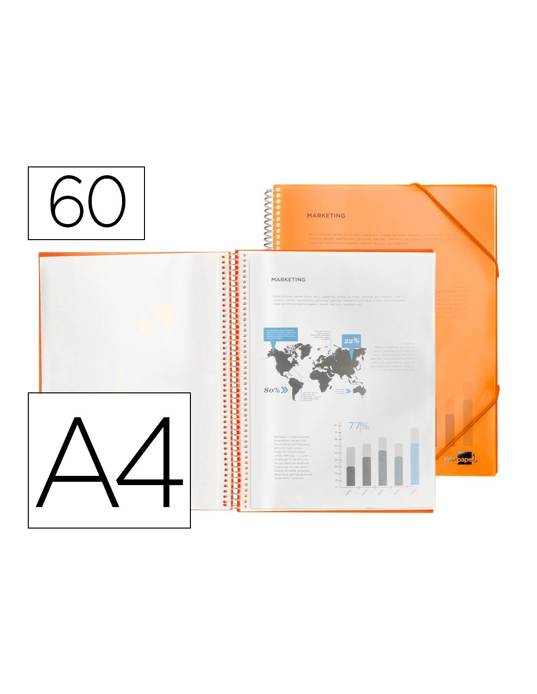 Carpeta escaparate fabricada en polipropileno translúcido. Cubierta rígida. Encuadernada con espiral para mayor comodidad y cierre con gomilla. Portada 750 micras. Fundas 75 micras.