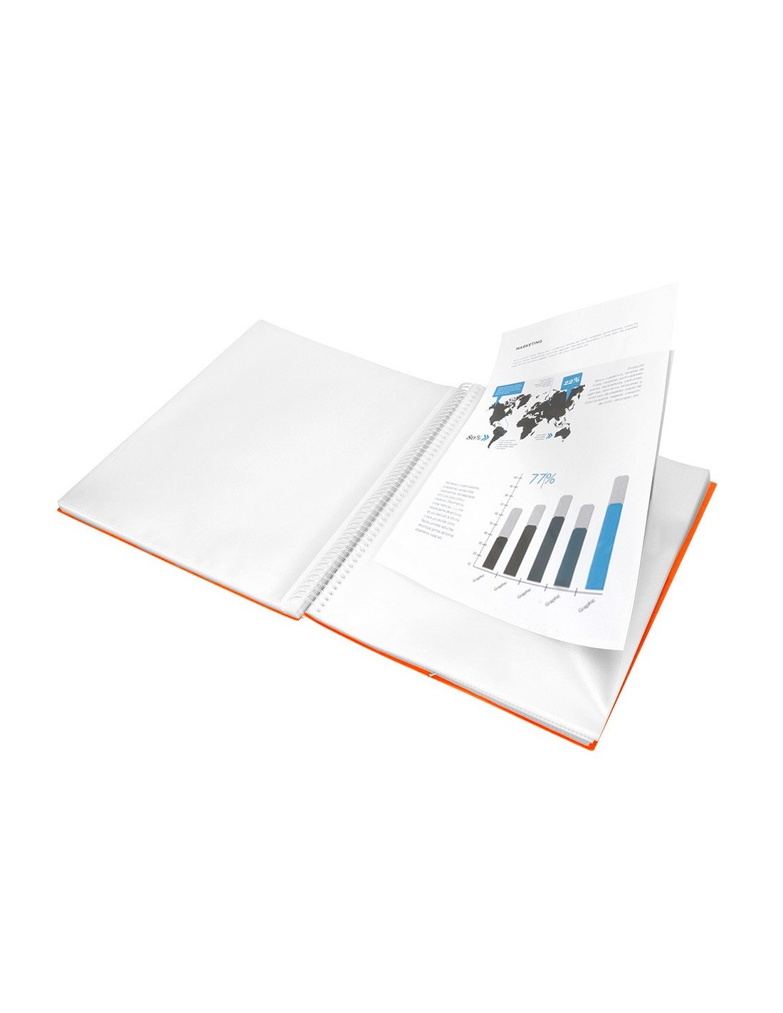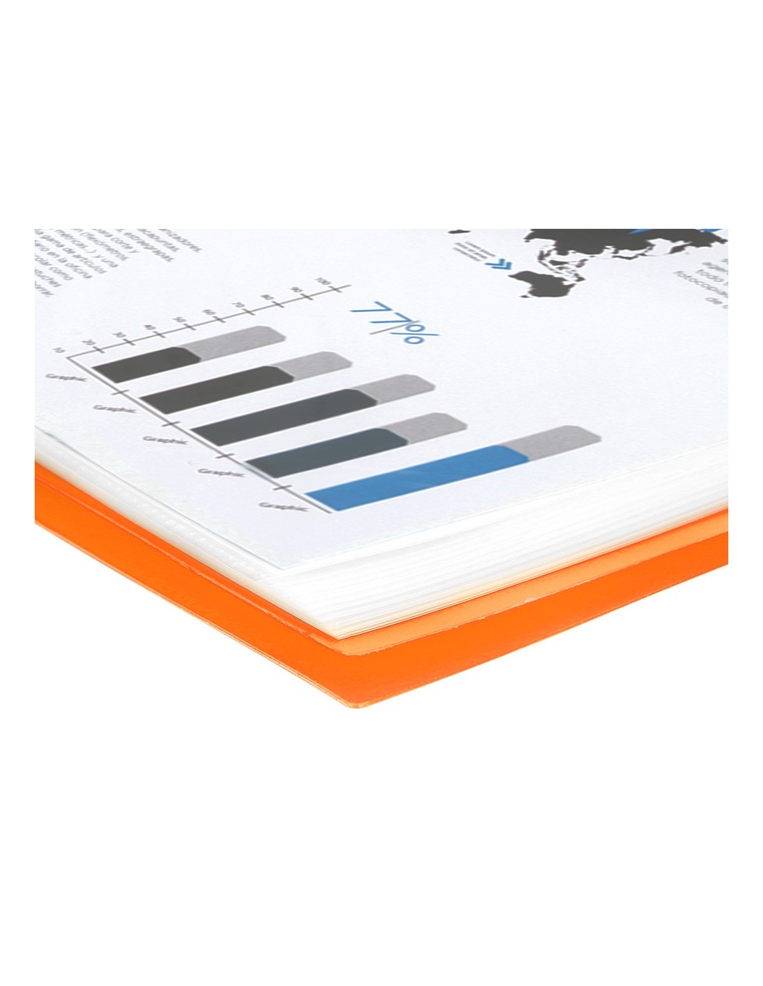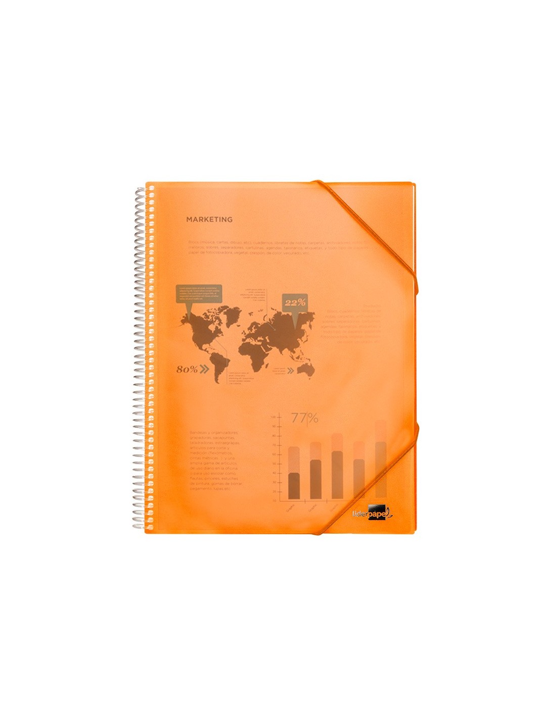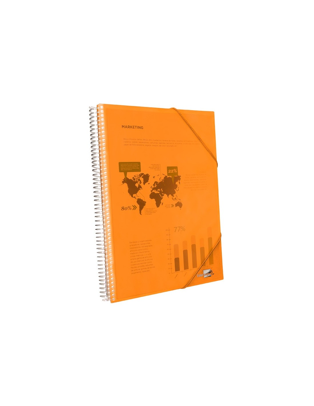 Carpeta escaparate fabricada en polipropileno translúcido. Cubierta rígida. Encuadernada con espiral para mayor comodidad y cierre con gomilla. Portada 750 micras. Fundas 75 micras.