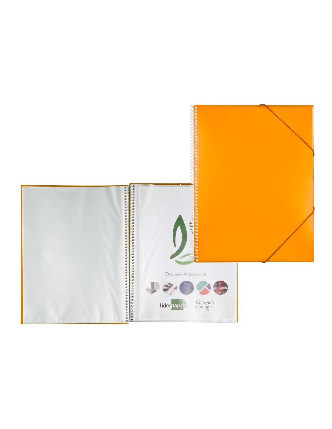 Carpeta escaparate fabricada en polipropileno. Cubierta rígida. Encuadernada con espiral para mayor comodidad y cierre con gomilla. Portada 750 micras. Fundas 75 micras.
