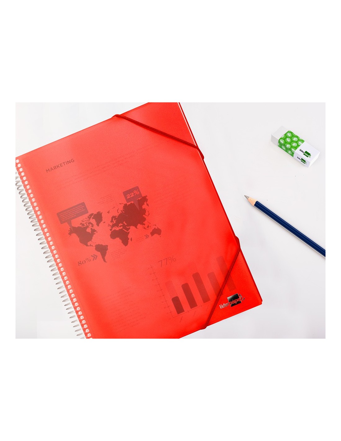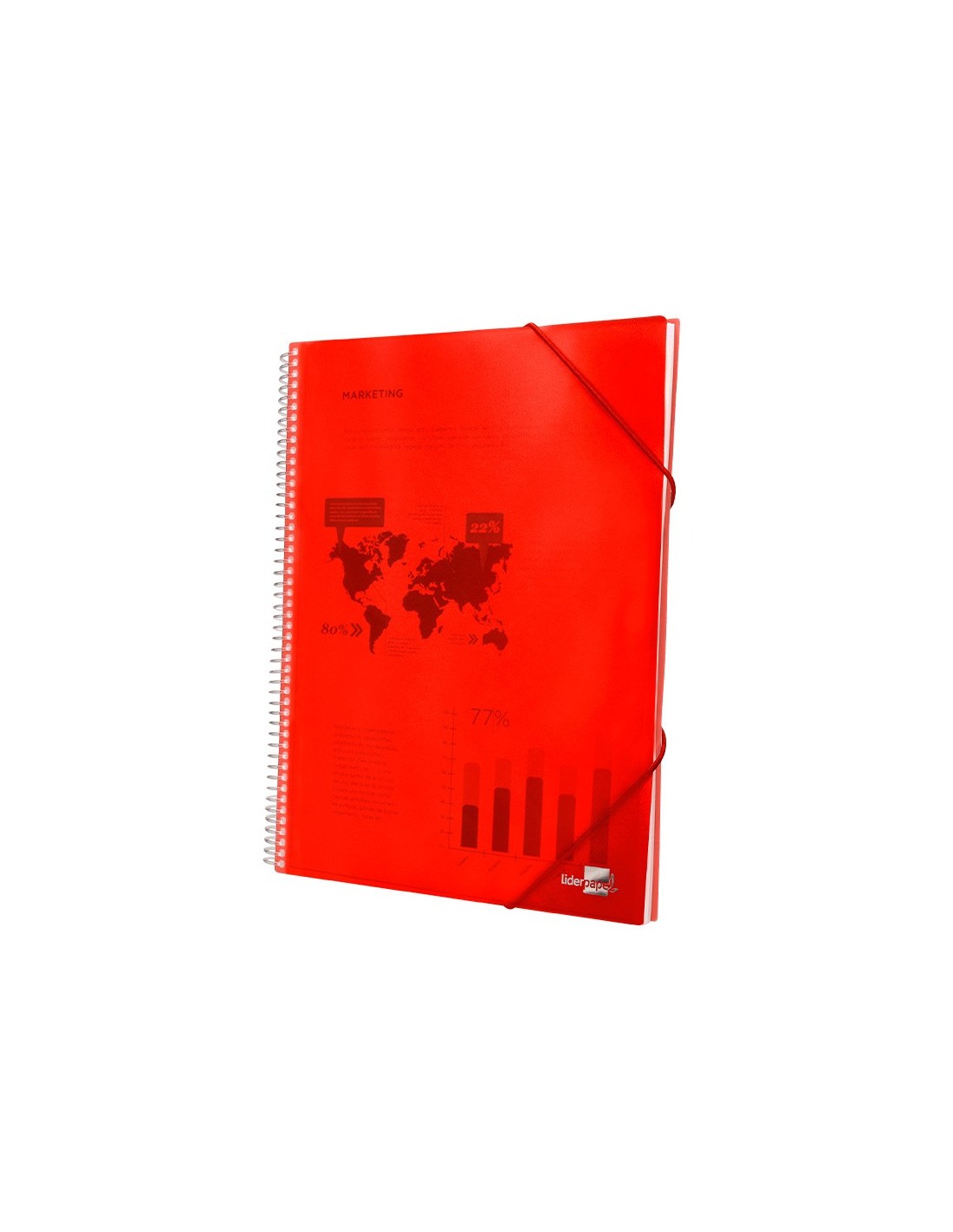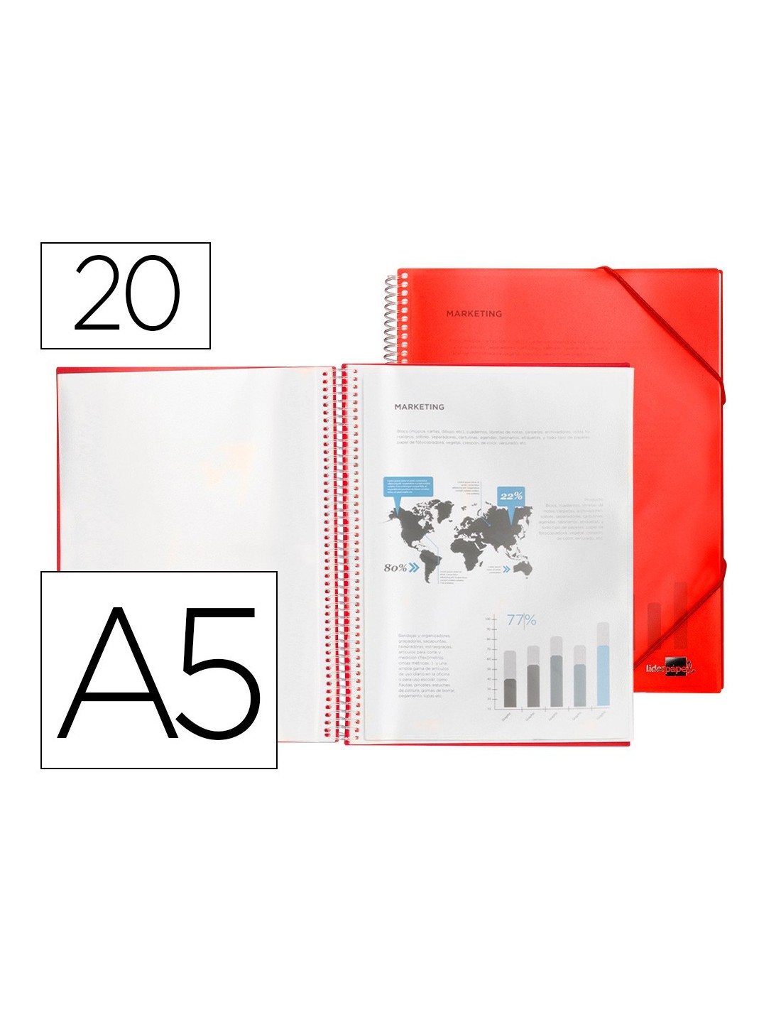 Carpeta escaparate fabricada en polipropileno translúcido. Cubierta rígida. Encuadernada con espiral para mayor comodidad y cierre con gomilla. Portada 750 micras. Fundas 75 micras.