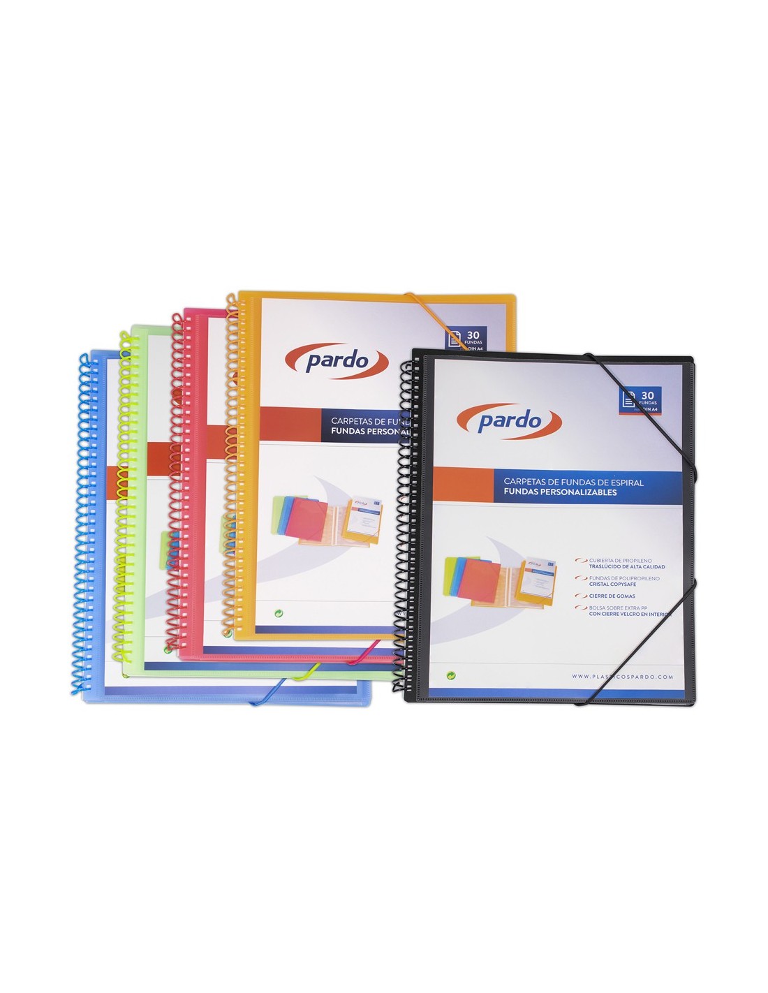 Carpeta espiral 30 fundas con tapas personalizables. Con fundas interiores cristal 90 micras y sobre. Cierre de gomas. Color negro.