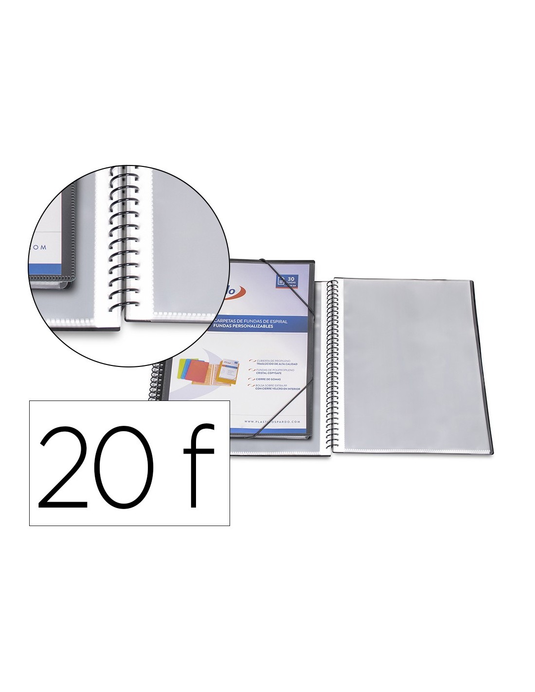 Carpeta espiral 20 fundas con tapas personalizables. Con fundas interiores cristal 90 micras y sobre. Cierre de gomas. Color negro.