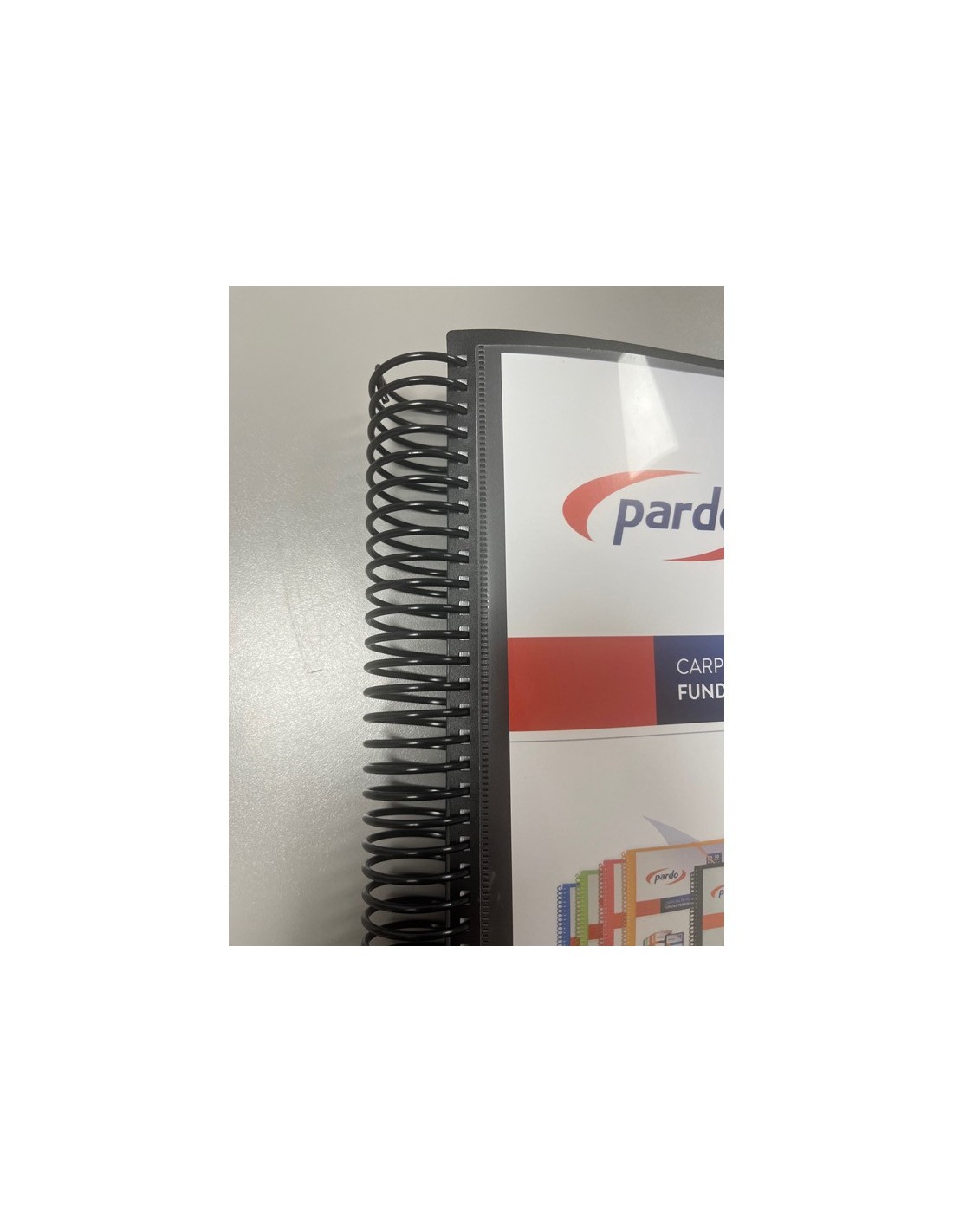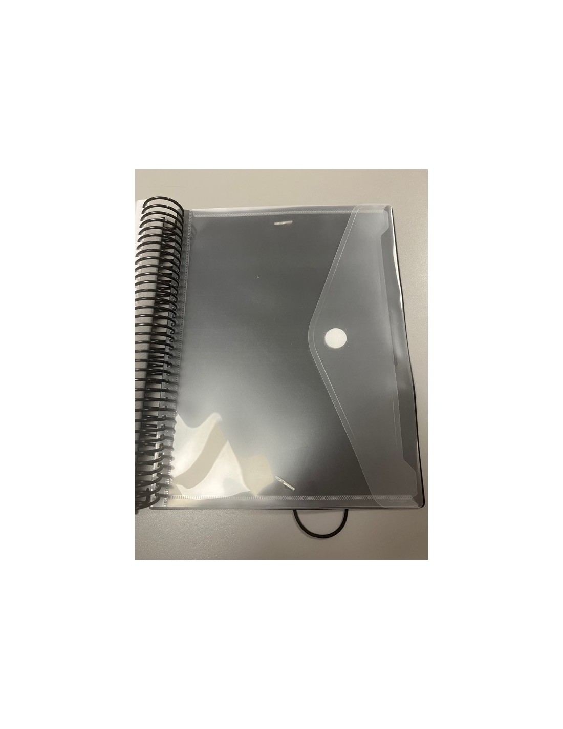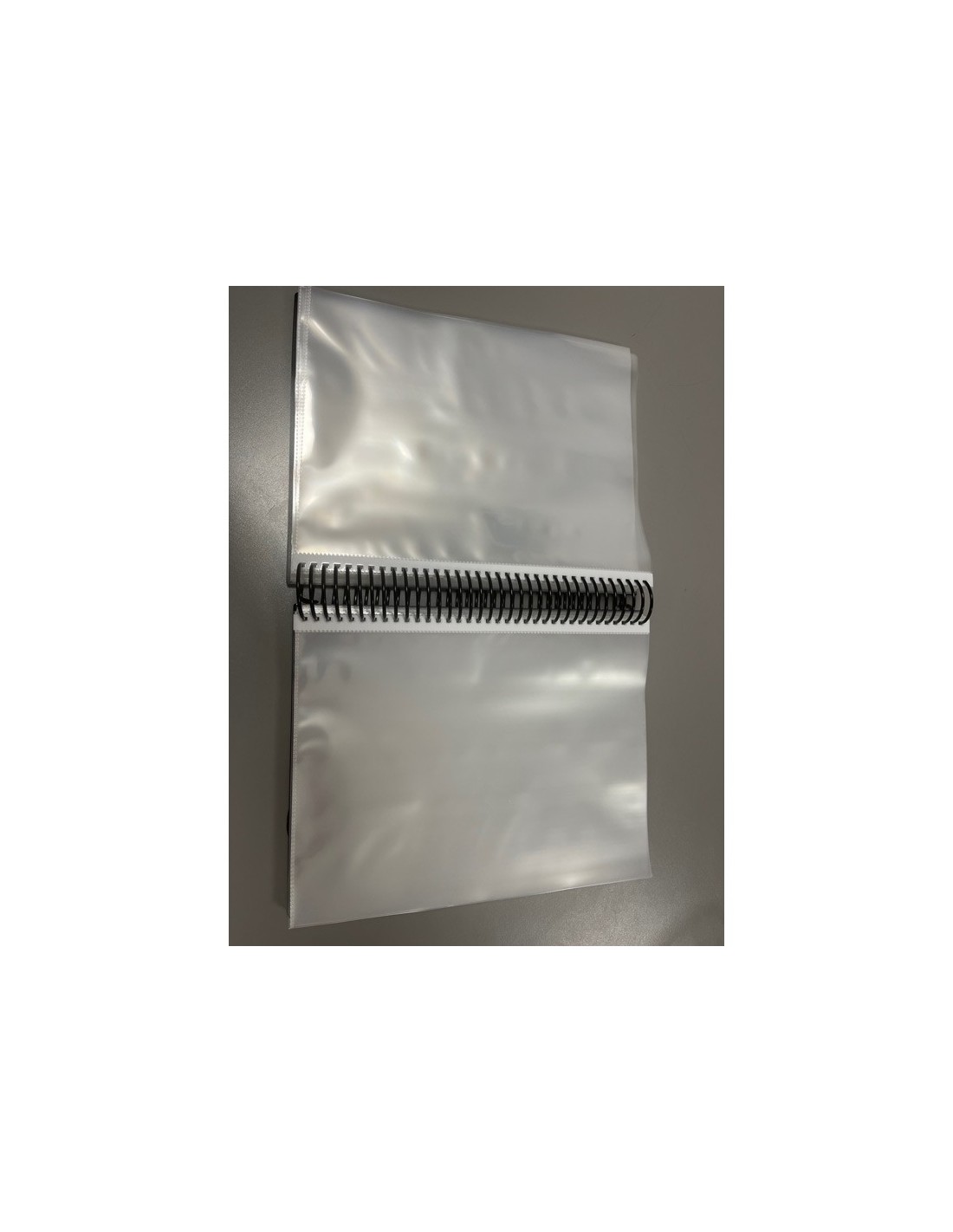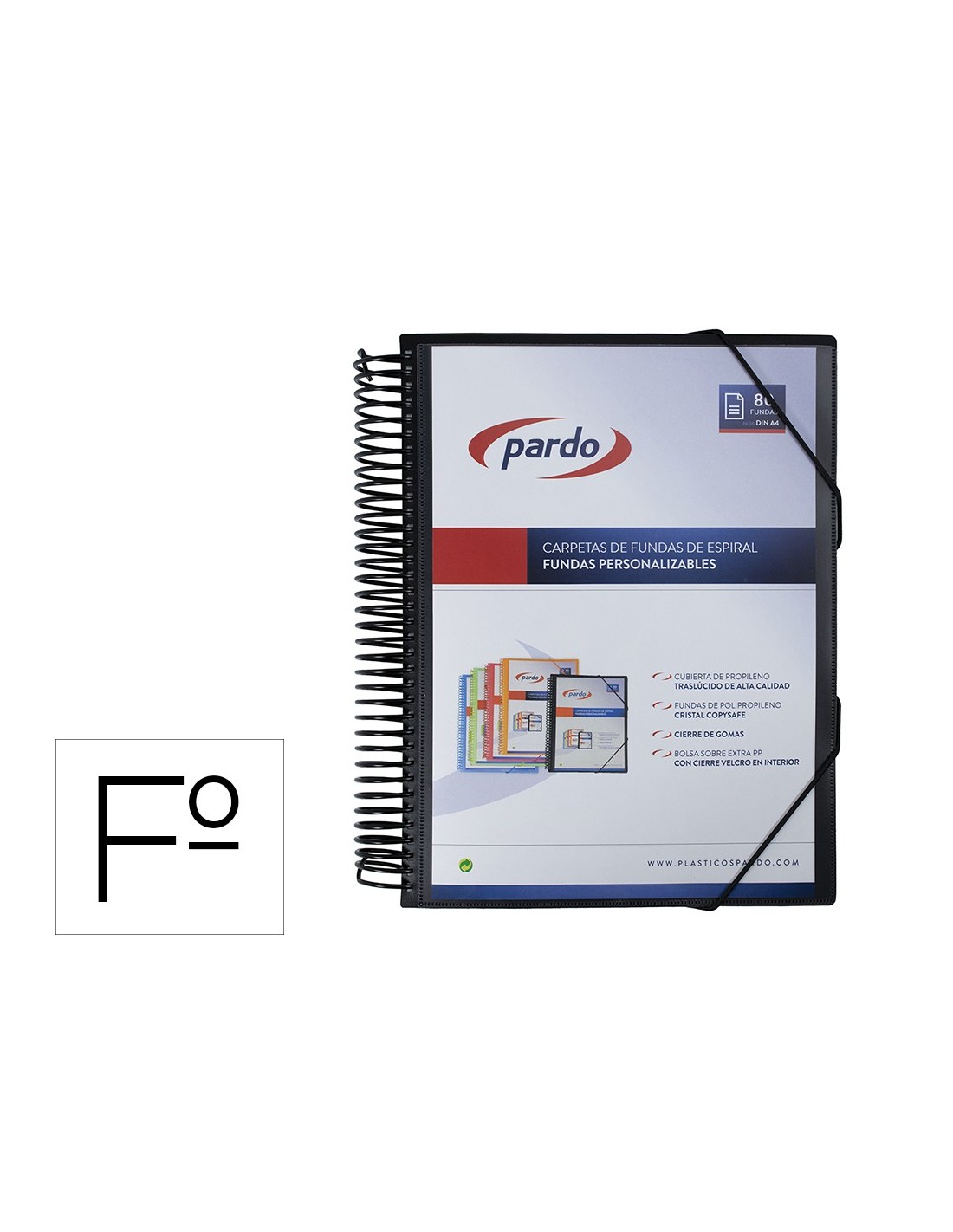 Carpeta personalizable espiral de 80 fundas extra de polipropileno cristal90 micras y sobre con velcro. Cierre de gomas.
