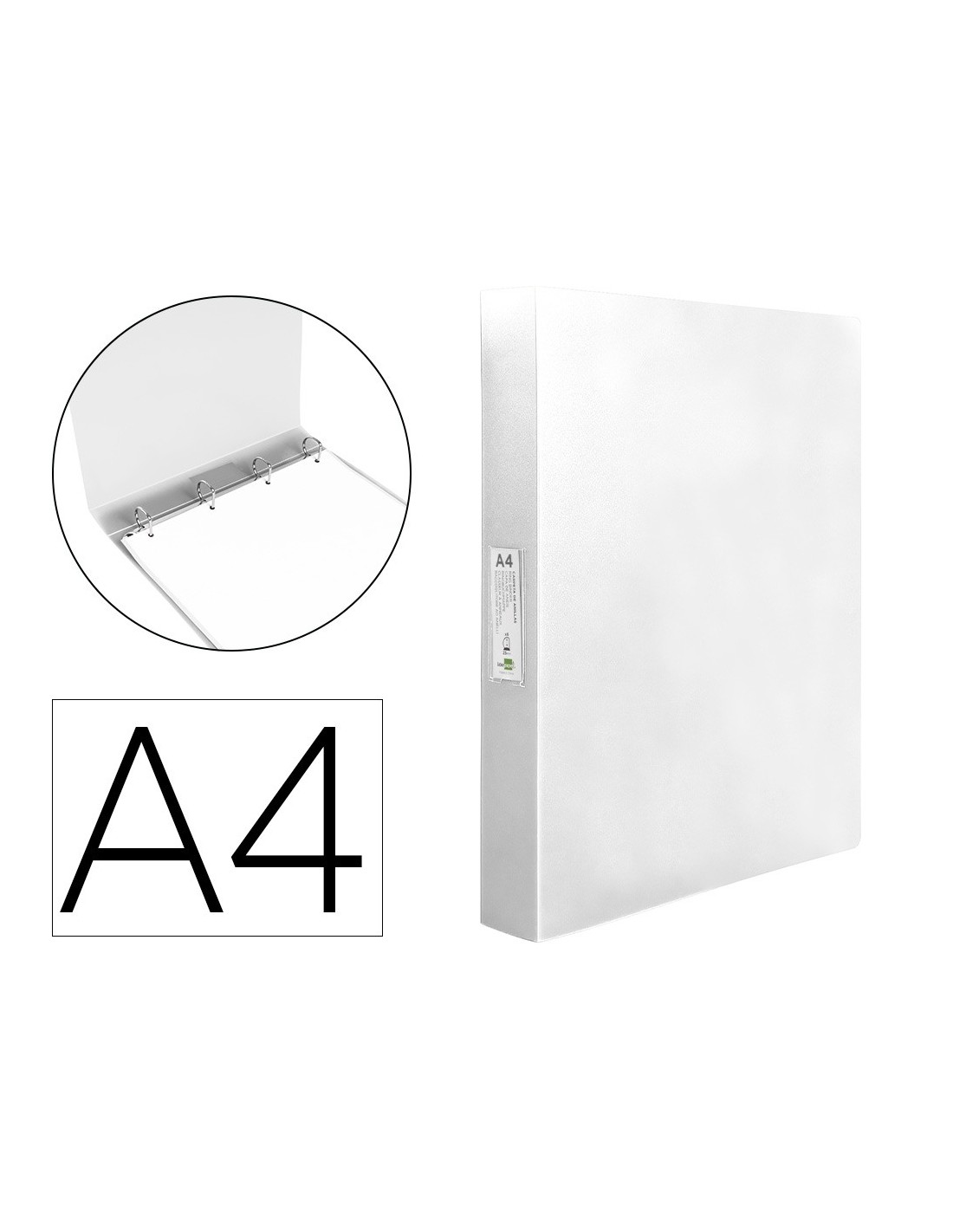 Fabricada en polipropileno. Carpeta de anillas de con tarjetero. Ancho de lomo: 40 mm. Formato DIN A4. Medidas: 260 x 315 mm.