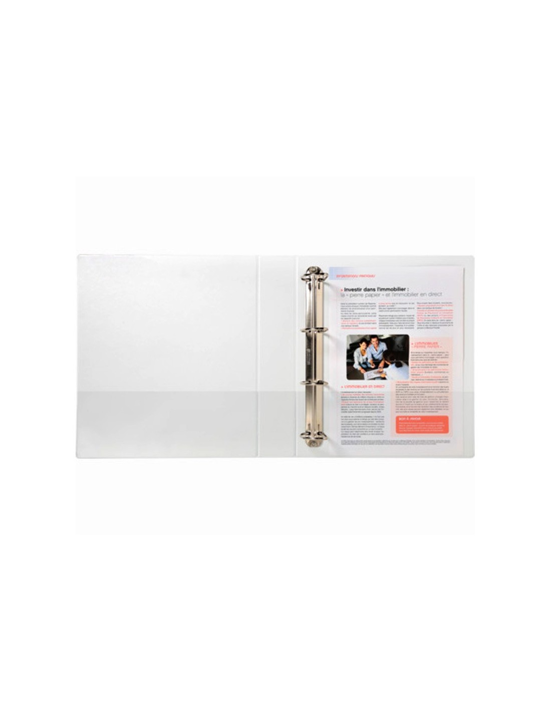Carpeta de anillas personalizable fabricada en polipropileno. Anillas mixtas. 3 bolsillos exteriores y un bolsillo interior horizontal. Color blanco. Formato DIN A4+.