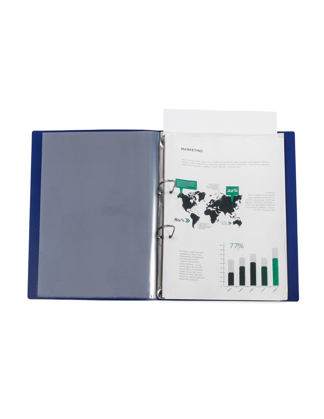 Carpeta de anillas mixtas fabricada en polipropileno. Con funda en la portada que permite su personalización e identificación. Formato DIN A4.