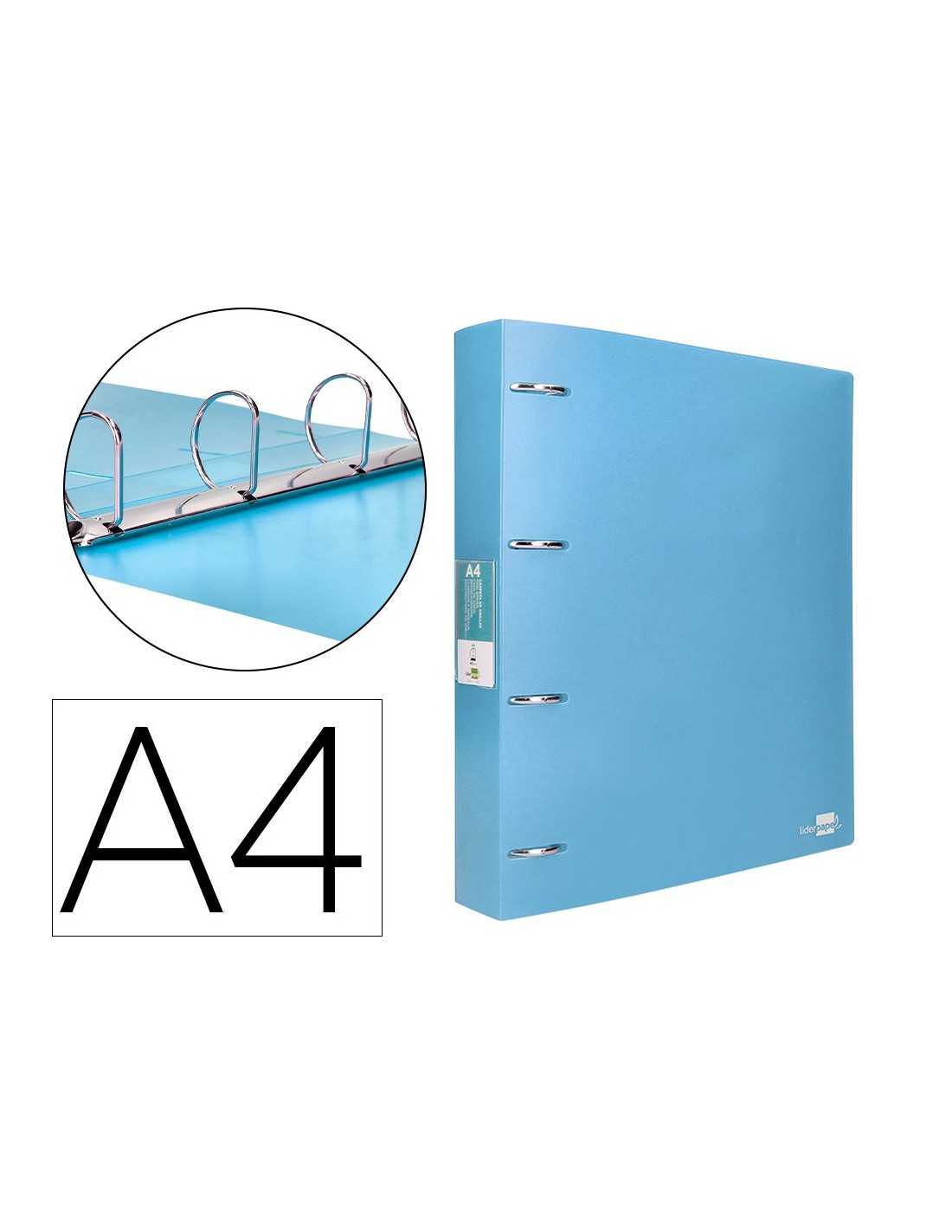 Fabricada en polipropileno. Carpeta de anillas de con tarjetero. Ancho de lomo: 40 mm. Formato DIN A4. Medidas: 260 x 315 mm.