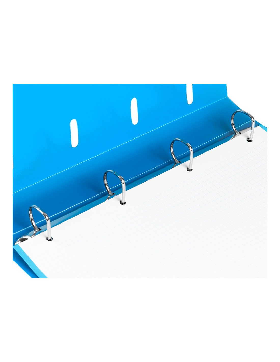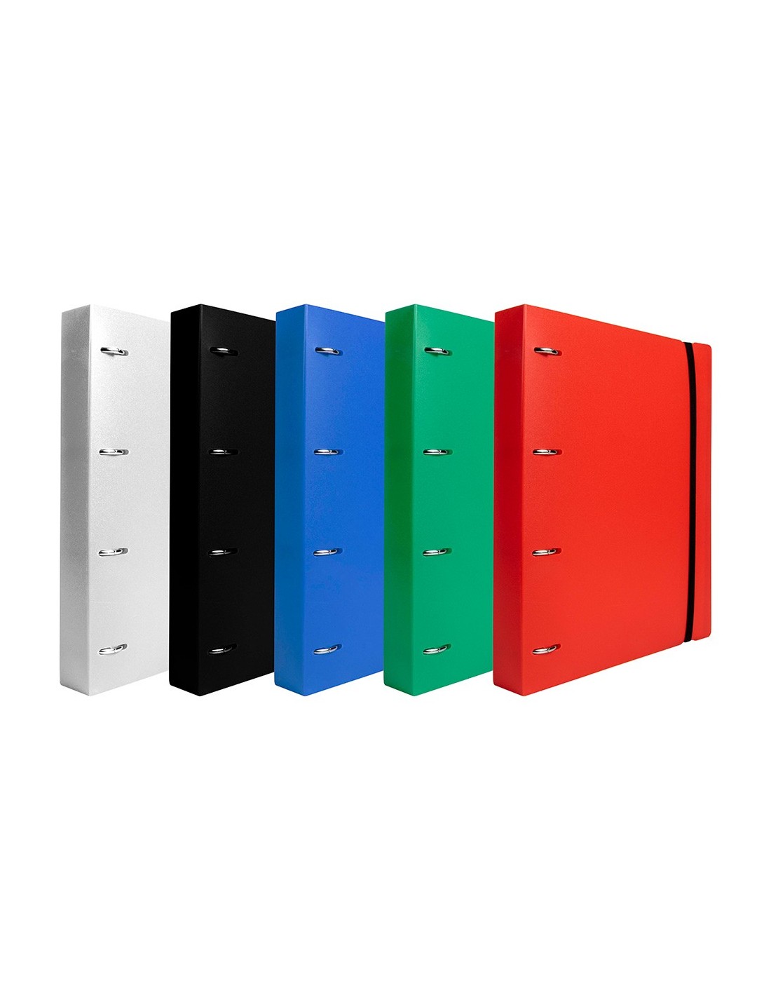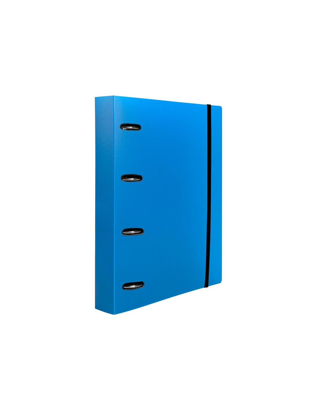 Carpeta con recambio de 4 anillas mixtas, fabricada en polipropileno de 1000 micras. Cierre con gomilla del mismo color. Con ranuras para anillas. Papel interior de 80 g/m² con cuadricula 5 x 5 mm y 4 taladros. 100 hojas.