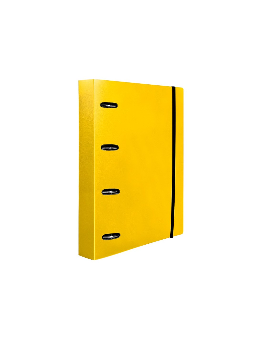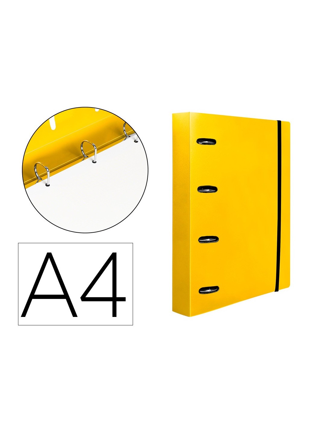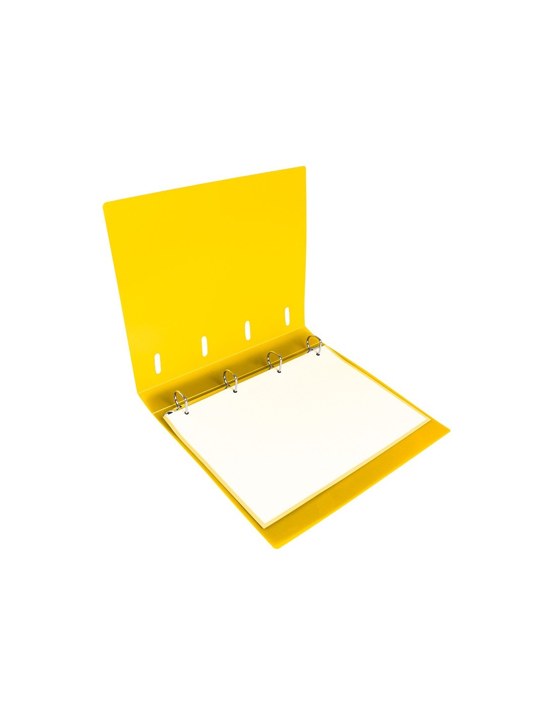 Carpeta con recambio de 4 anillas mixtas, fabricada en polipropileno de 1000 micras. Cierre con gomilla del mismo color. Con ranuras para anillas. Papel interior de 80 g/m² con cuadricula 5 x 5 mm y 4 taladros. 100 hojas.