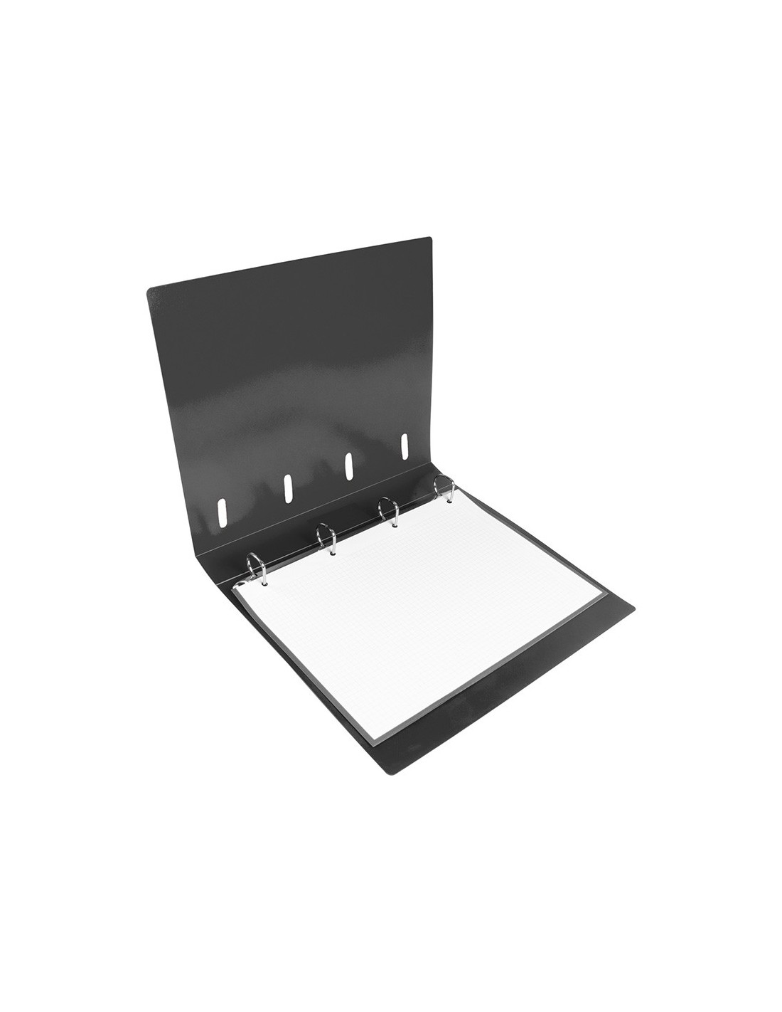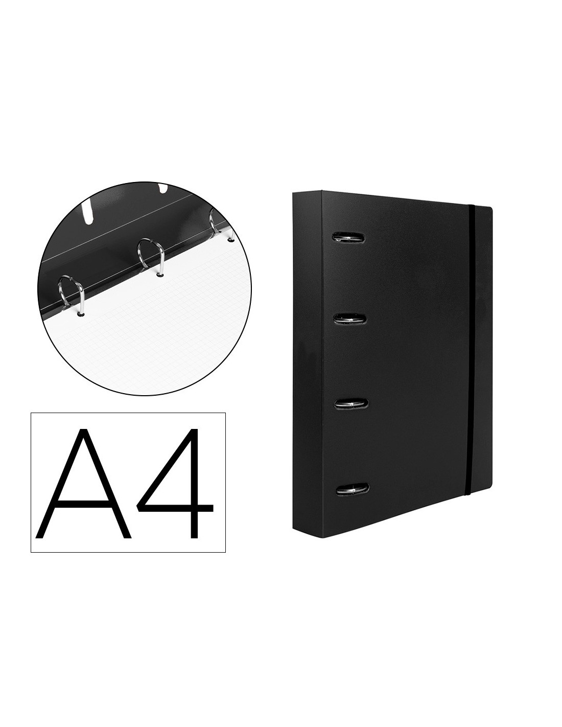 Carpeta con recambio de 4 anillas mixtas, fabricada en polipropileno de 1000 micras. Cierre con gomilla del mismo color. Con ranuras para anillas. Papel interior de 80 g/m² con cuadricula 5 x 5 mm y 4 taladros. 100 hojas.