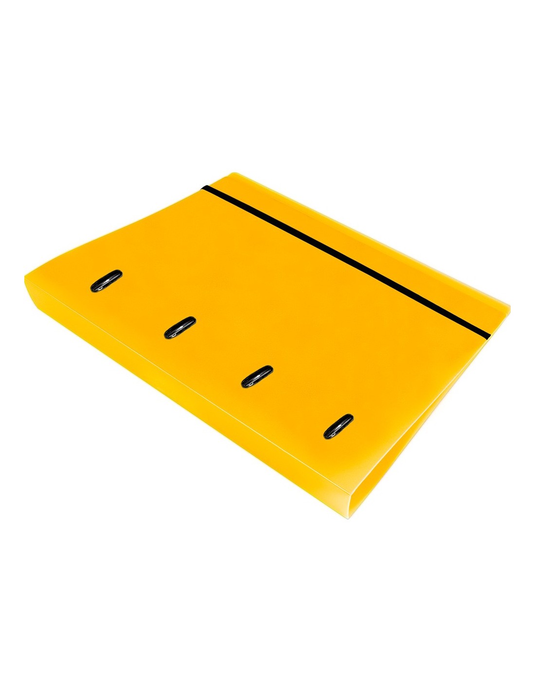 Carpeta con recambio de 4 anillas mixtas, fabricada en polipropileno de 1000 micras. Cierre con gomilla del mismo color. Con ranuras para anillas. Papel interior de 80 g/m² con cuadricula 5 x 5 mm y 4 taladros. 100 hojas.