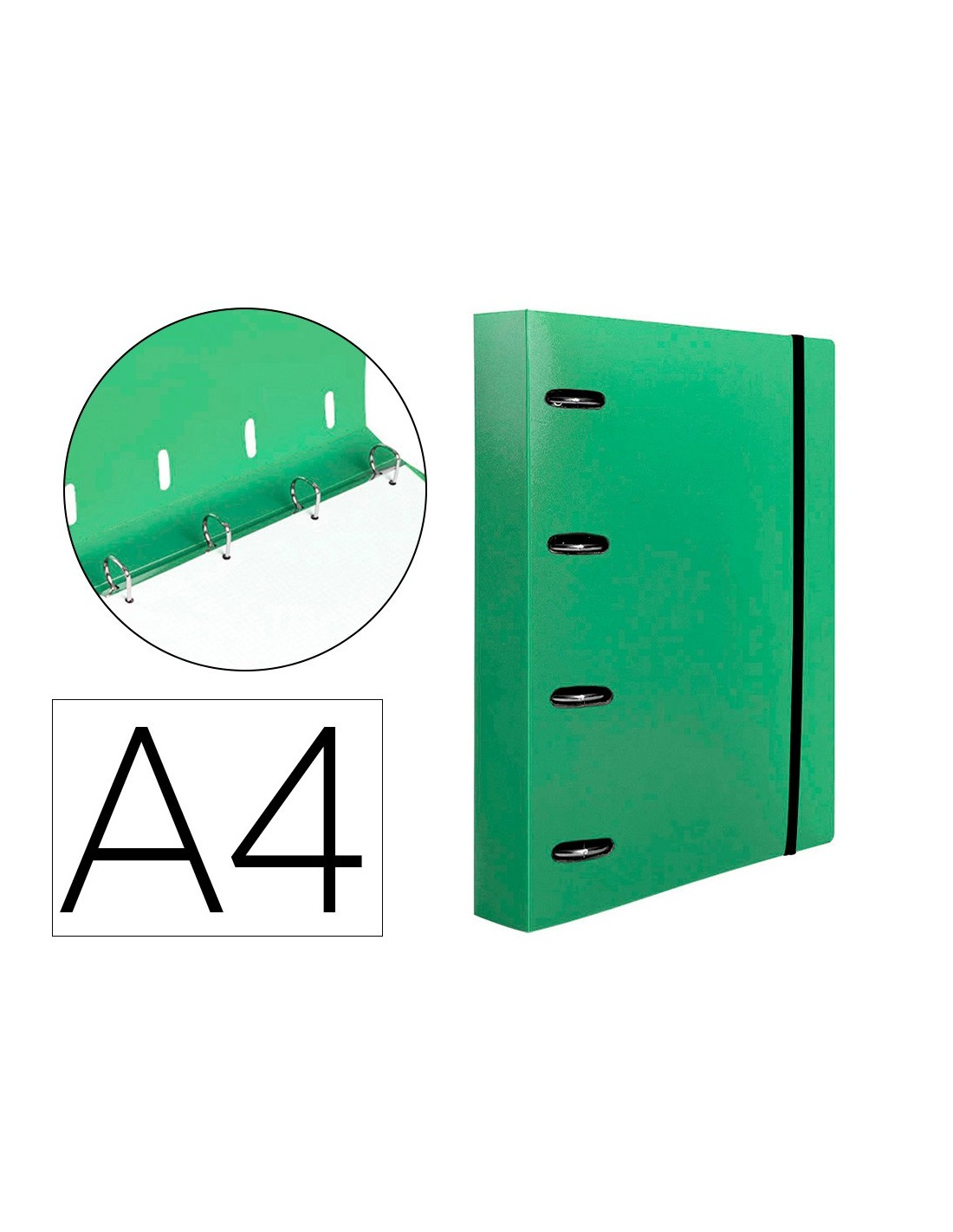 Carpeta con recambio de 4 anillas mixtas, fabricada en polipropileno de 1000 micras. Cierre con gomilla del mismo color. Con ranuras para anillas. Papel interior de 80 g/m² con cuadricula 5 x 5 mm y 4 taladros. 100 hojas.