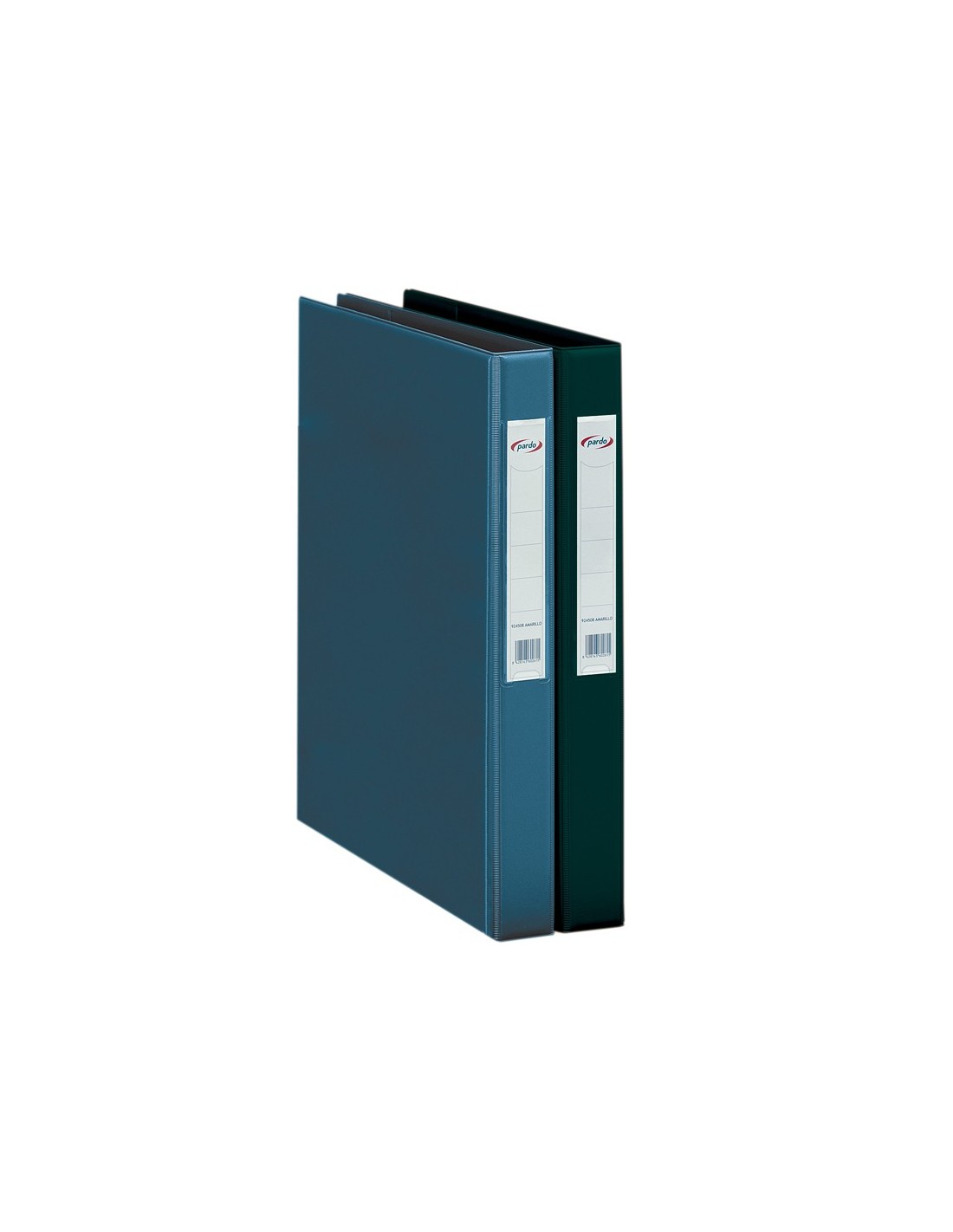 Carpeta de 2 anillas fabricada en cartón forrado en plástico soldado. 3 mm de grosor. Tarjetero en lomo y funda de plástico en interior de portada. Tamaño folio. Medidas: 285 x 335 mm.