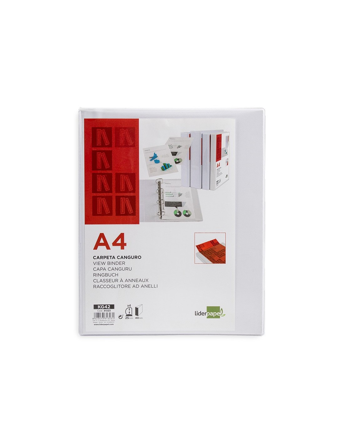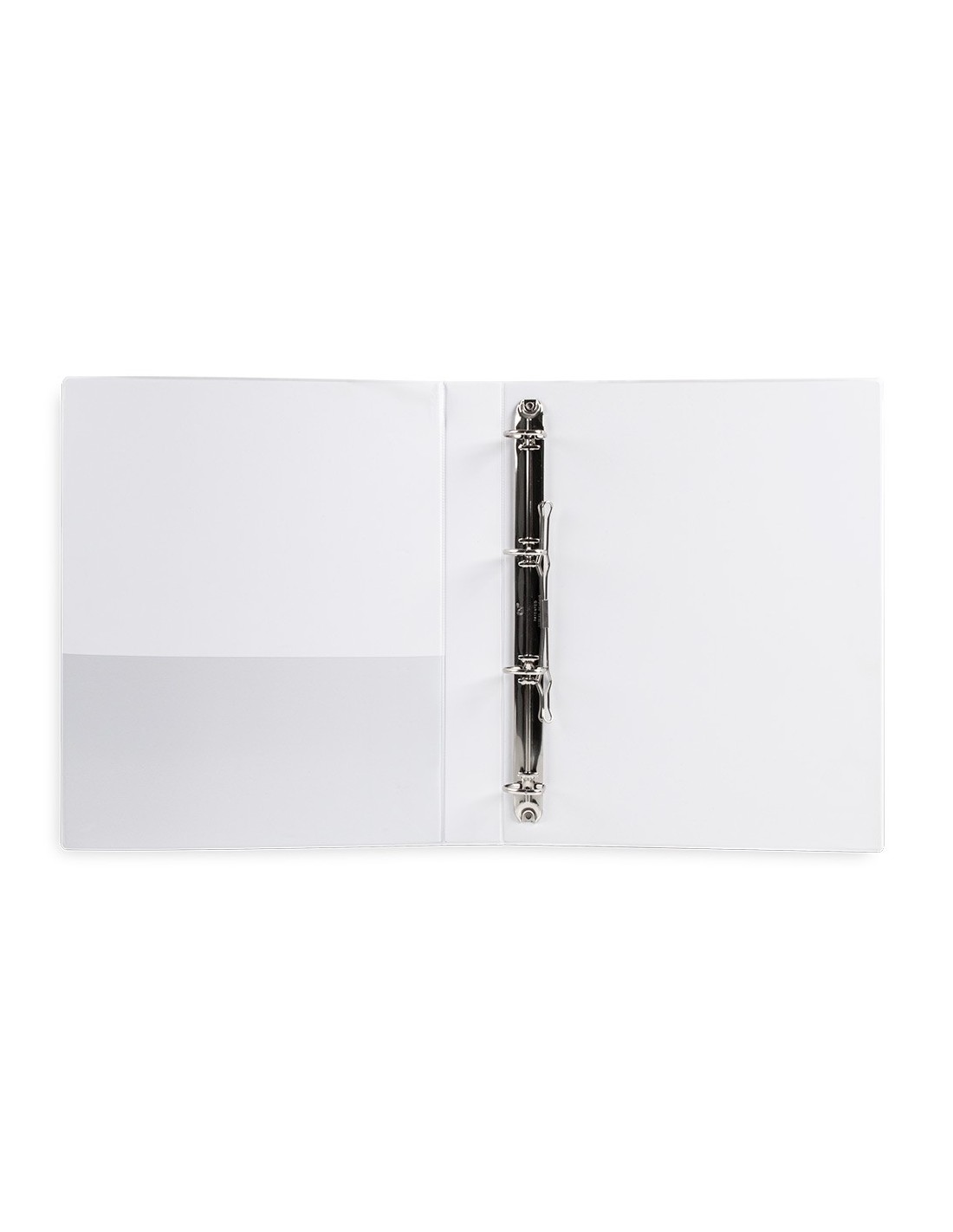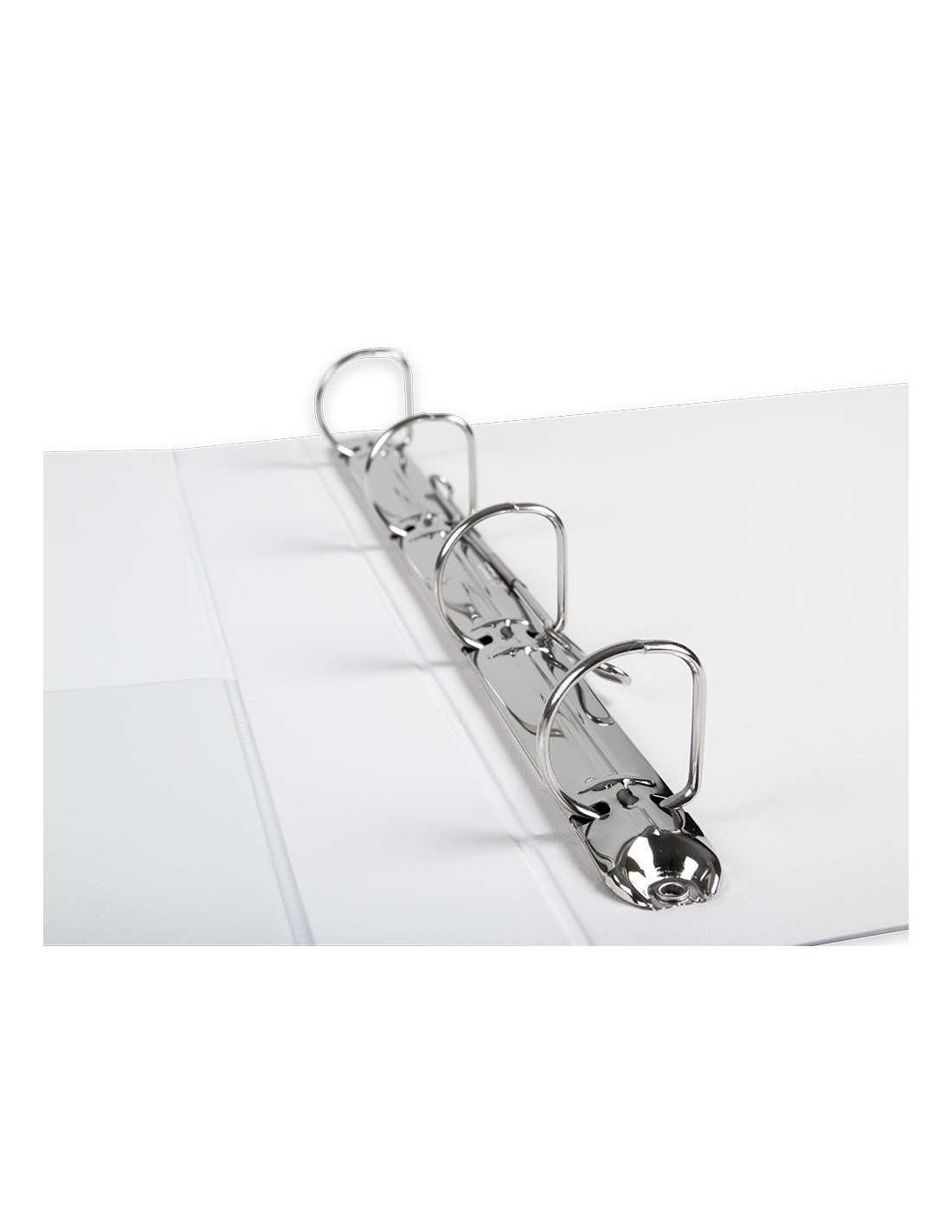 Carpeta fabricada en cartón forrado en plástico soldado de color blanco. 5 mm de grosor. Con funda transparente soldada en su interior. Carpeta con funda en la portada, contraportada y lomo que permite su personalización e identificación. Anillas mixtas. Con compresor metálico. Formato DIN A4. Medidas: 283 x 320 mm.