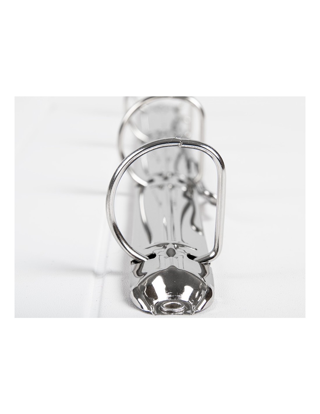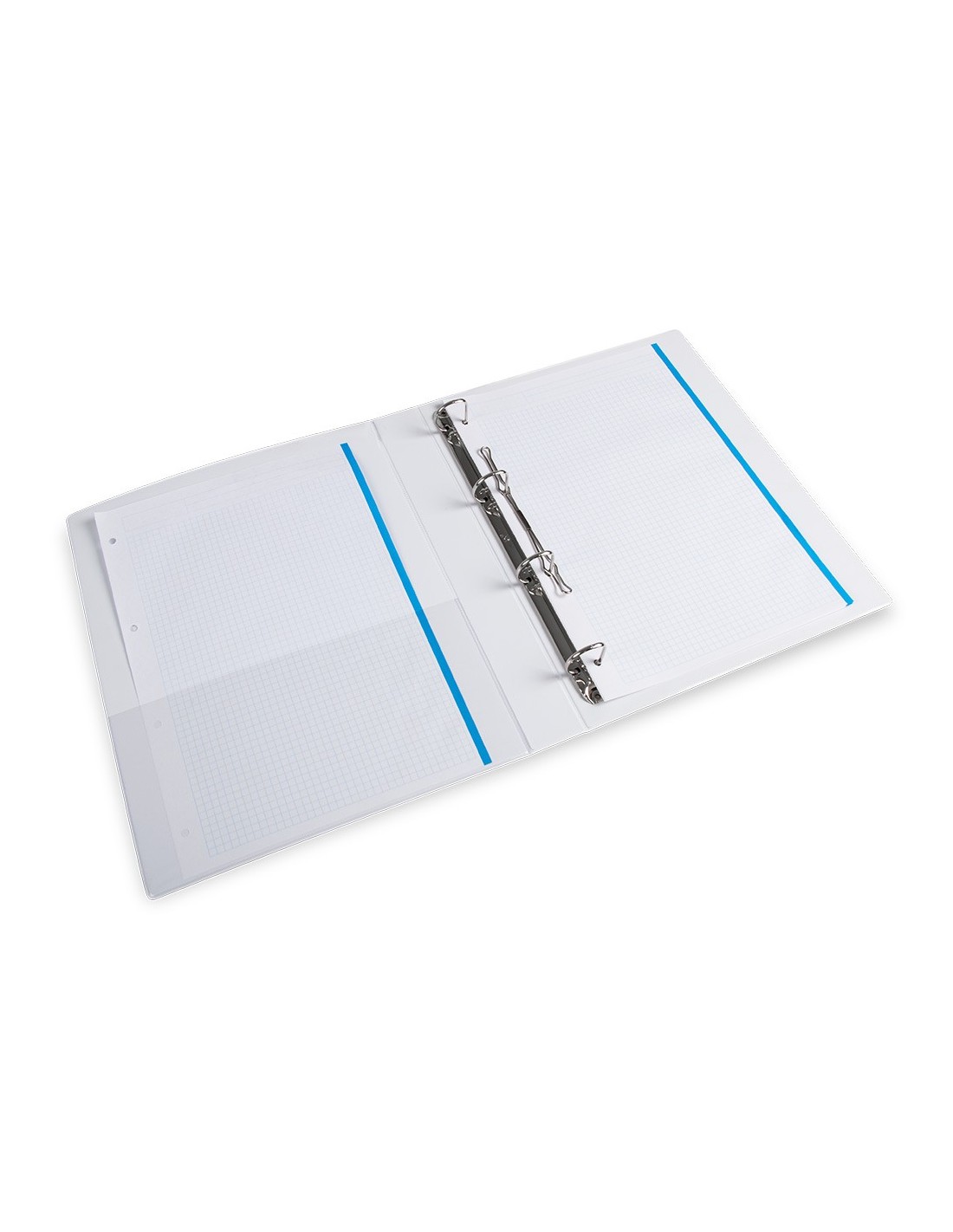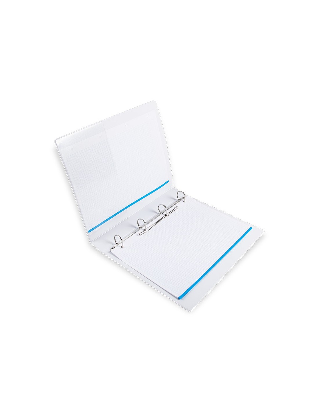 Carpeta fabricada en cartón forrado en plástico soldado de color blanco. 5 mm de grosor. Con funda transparente soldada en su interior. Carpeta con funda en la portada, contraportada y lomo que permite su personalización e identificación. Anillas mixtas. Con compresor metálico. Formato DIN A4. Medidas: 283 x 320 mm.